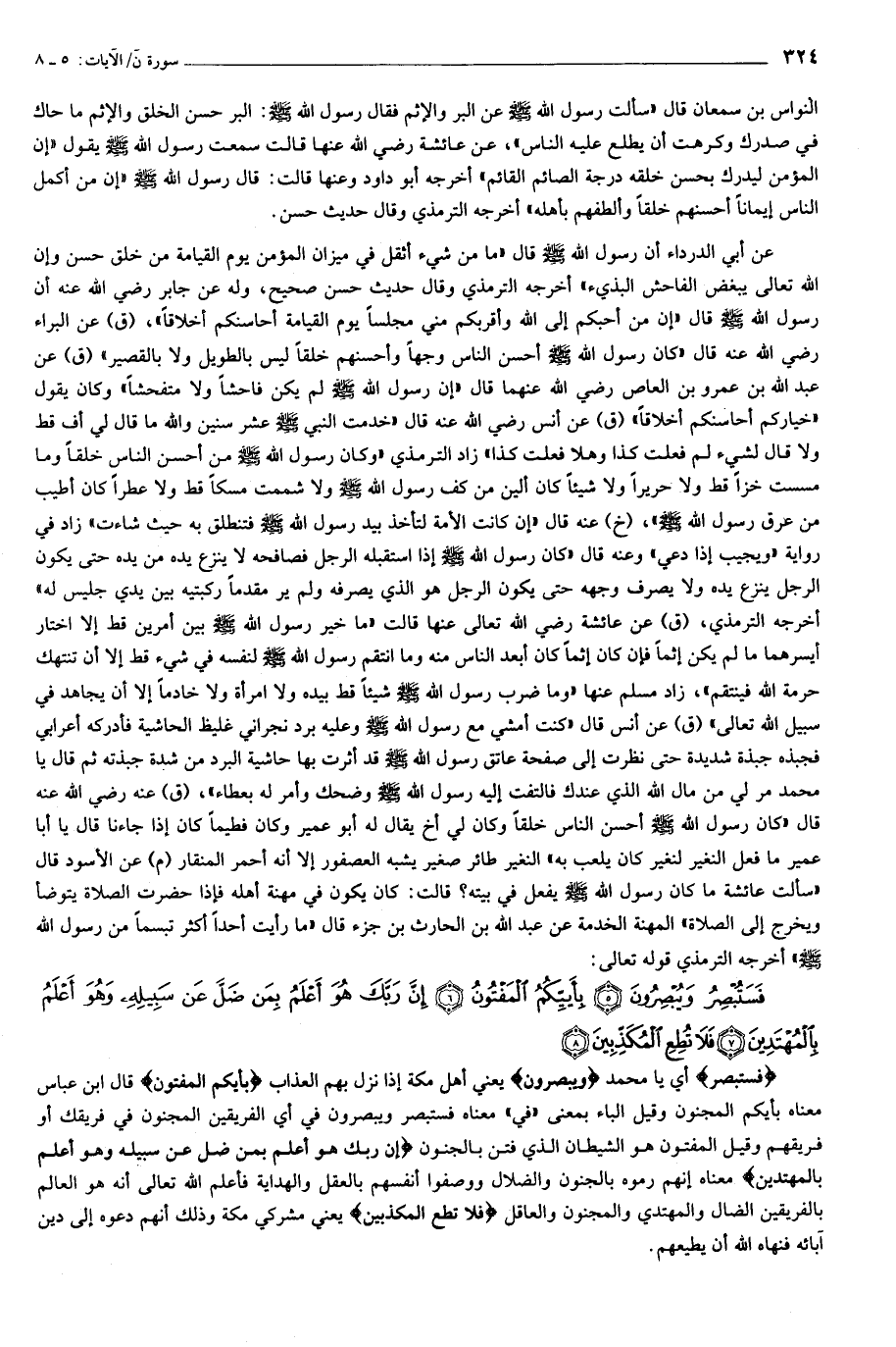 عن أبي الدرداء أن رسول الله صلّى الله عليه وسلّم قال «ما من شيء أثقل في ميزان المؤمن يوم القيامة من خلق حسن وإن الله تعالى يبغض الفاحش البذيء» أخرجه الترمذي وقال حديث حسن صحيح، وله عن جابر رضي الله عنه أن رسول الله صلّى الله عليه وسلّم قال «إن من أحبكم إلى الله وأقربكم مني مجلسا يوم القيامة أحاسنكم أخلاقا»، (ق) عن البراء رضي الله عنه قال «كان رسول الله صلّى الله عليه وسلّم أحسن الناس وجها وأحسنهم خلقا ليس بالطويل ولا بالقصير» (ق) عن عبد الله بن عمرو بن العاص رضي الله عنهما قال «إن رسول الله صلّى الله عليه وسلّم لم يكن فاحشا ولا متفحشا» وكان يقول «خياركم أحاسنكم أخلاقا» (ق) عن أنس رضي الله عنه قال «خدمت النبي صلّى الله عليه وسلّم عشر سنين والله ما قال لي أف قط ولا قال لشيء لم فعلت كذا وهلا فعلت كذا» زاد الترمذي «وكان رسول الله صلّى الله عليه وسلّم من أحسن الناس خلقا وما مسست خزا قط ولا حريرا ولا شيئا كان ألين من كف رسول الله صلّى الله عليه وسلّم ولا شممت مسكا قط ولا عطرا كان أطيب من عرق رسول الله صلّى الله عليه وسلّم»، (خ) عنه قال «إن كانت الأمة لتأخذ بيد رسول الله صلّى الله عليه وسلّم فتنطلق به حيث شاءت» زاد في رواية «ويجيب إذا دعي» وعنه قال «كان رسول الله صلّى الله عليه وسلّم إذا استقبله الرجل فصافحه لا ينزع يده من يده حتى يكون الرجل ينزع يده ولا يصرف وجهه حتى يكون الرجل هو الذي يصرفه ولم ير مقدما ركبتيه بين يدي جليس له» أخرجه الترمذي، (ق) عن عائشة رضي الله تعالى عنها قالت «ما خير رسول الله صلّى الله عليه وسلّم بين أمرين قط إلا اختار أيسرهما ما لم يكن إثما فإن كان إثما كان أبعد الناس منه وما انتقم رسول الله صلّى الله عليه وسلّم لنفسه في شيء قط إلا أن تنتهك حرمة الله فينتقم»، زاد مسلم عنها «وما ضرب رسول الله صلّى الله عليه وسلّم شيئا قط بيده ولا امرأة ولا خادما إلا أن يجاهد في سبيل الله تعالى» (ق) عن أنس قال «كنت أمشي مع رسول الله صلّى الله عليه وسلّم وعليه برد نجراني غليظ الحاشية فأدركه أعرابي فجبذه جبذة شديدة حتى نظرت إلى صفحة عاتق رسول الله صلّى الله عليه وسلّم قد أثرت بها حاشية البرد من شدة جبذته ثم قال يا محمد مر لي من مال الله الذي عندك فالتفت إليه رسول الله صلّى الله عليه وسلّم وضحك وأمر له بعطاء»، (ق) عنه رضي الله عنه قال «كان رسول الله صلّى الله عليه وسلّم أحسن الناس خلقا وكان لي أخ يقال له أبو عمير وكان فطيما كان إذا جاءنا قال يا أبا عمير ما فعل النغير لنغير كان يلعب به» النغير طائر صغير يشبه العصفور إلا أنه أحمر المنقار (م) عن الأسود قال «سألت عائشة ما كان رسول الله صلّى الله عليه وسلّم يفعل في بيته؟ قالت: كان يكون في مهنة أهله فإذا حضرت الصلاة يتوضأ ويخرج إلى الصلاة» المهنة الخدمة عن عبد الله بن الحارث بن جزء قال «ما رأيت أحدا أكثر تبسما من رسول الله صلّى الله عليه وسلّم» أخرجه الترمذي قوله تعالى: