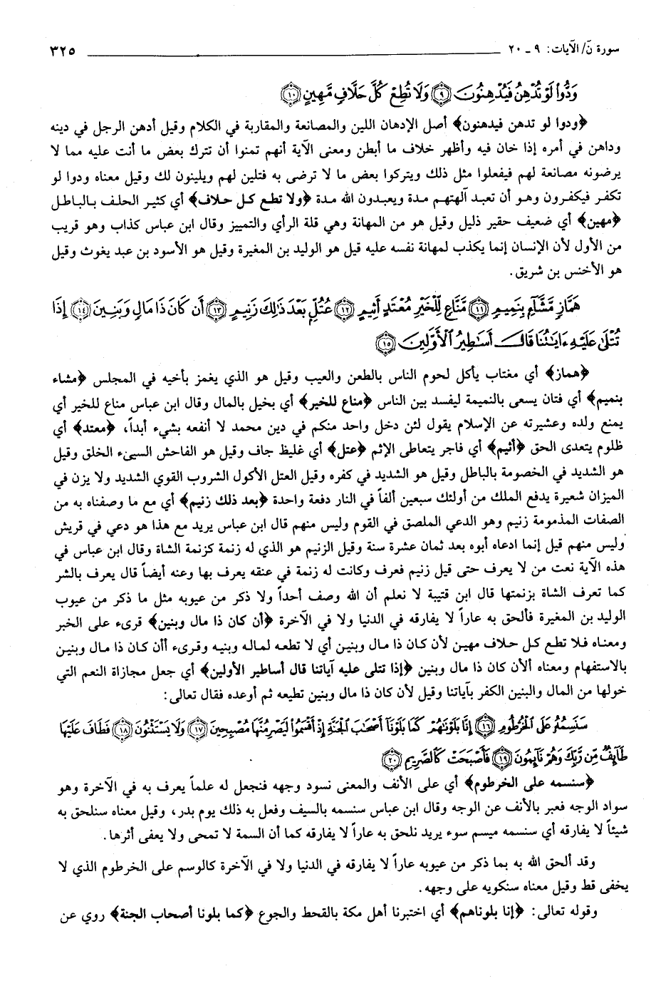 وَدُّوا لَوْ تُدْهِنُ فَيُدْهِنُونَ أصل الإدهان اللين والمصانعة والمقاربة في الكلام وقيل أدهن الرجل في دينه وداهن في أمره إذا خان فيه وأظهر خلاف ما أبطن ومعنى الآية أنهم تمنوا أن تترك بعض ما أنت عليه مما لا يرضونه مصانعة لهم فيفعلوا مثل ذلك ويتركوا بعض ما لا ترضى به فتلين لهم ويلينون لك وقيل معناه ودوا لو تكفر فيكفرون وهو أن تعبد آلهتهم مدة ويعبدون الله مدة وَلا تُطِعْ كُلَّ حَلَّافٍ أي كثير الحلف بالباطل مَهِينٍ أي ضعيف حقير ذليل وقيل هو من المهانة وهي قلة الرأي والتمييز وقال ابن عباس كذاب وهو قريب من الأول لأن الإنسان إنما يكذب لمهانة نفسه عليه قيل هو الوليد بن المغيرة وقيل هو الأسود بن عبد يغوث وقيل هو الأخنس بن شريق.