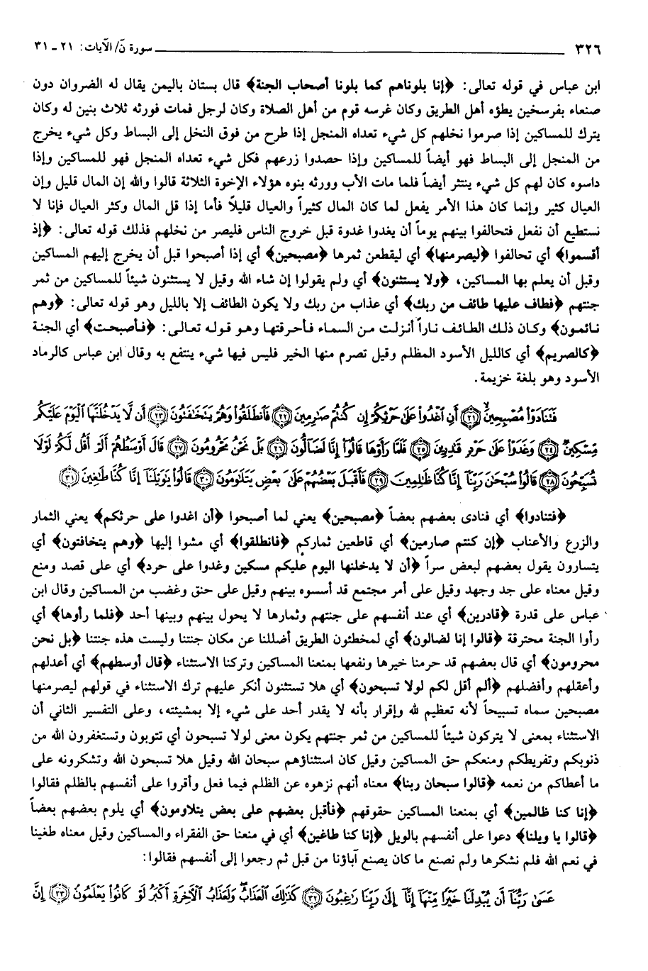 ابن عباس في قوله تعالى: إِنَّا بَلَوْناهُمْ كَما بَلَوْنا أَصْحابَ الْجَنَّةِ قال بستان باليمن يقال له الضروان دون صنعاء بفرسخين يطؤه أهل الطريق وكان غرسه قوم من أهل الصلاة وكان لرجل فمات فورثه ثلاث بنين له وكان يترك للمساكين إذا صرموا نخلهم كل شيء تعداه المنجل إذا طرح من فوق النخل إلى البساط وكل شيء يخرج من المنجل إلى البساط فهو أيضا للمساكين وإذا حصدوا زرعهم فكل شيء تعداه المنجل فهو للمساكين وإذا داسوه كان لهم كل شيء ينتثر أيضا فلما مات الأب وورثه بنوه هؤلاء الإخوة الثلاثة قالوا والله إن المال قليل وإن العيال كثير وإنما كان هذا الأمر يفعل لما كان المال كثيرا والعيال قليلا فأما إذا قل المال وكثر العيال فإنا لا نستطيع أن نفعل فتحالفوا بينهم يوما أن يغدوا غدوة قبل خروج الناس فليصر من نخلهم فذلك قوله تعالى: إِذْ أَقْسَمُوا أي تحالفوا لَيَصْرِمُنَّها أي ليقطعن ثمرها مُصْبِحِينَ أي إذا أصبحوا قبل أن يخرج إليهم المساكين وقبل أن يعلم بها المساكين، وَلا يَسْتَثْنُونَ أي ولم يقولوا إن شاء الله وقيل لا يستثنون شيئا للمساكين من ثمر جنتهم فَطافَ عَلَيْها طائِفٌ مِنْ رَبِّكَ أي عذاب من ربك ولا يكون الطائف إلا بالليل وهو قوله تعالى: وَهُمْ نائِمُونَ وكان ذلك الطائف نارا أنزلت من السماء فأحرقتها وهو قوله تعالى: فَأَصْبَحَتْ أي الجنة كَالصَّرِيمِ أي كالليل الأسود المظلم وقيل تصرم منها الخير فليس فيها شيء ينتفع به وقال ابن عباس كالرماد الأسود وهو بلغة خزيمة.