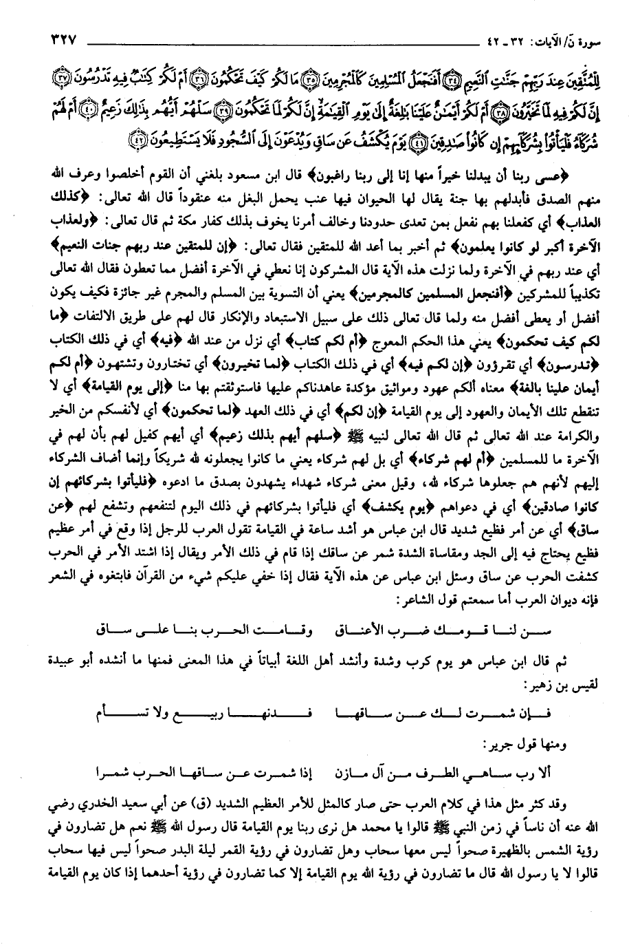 عَسى رَبُّنا أَنْ يُبْدِلَنا خَيْراً مِنْها إِنَّا إِلى رَبِّنا راغِبُونَ قال ابن مسعود بلغني أن القوم أخلصوا وعرف الله منهم الصدق فأبدلهم بها جنة يقال لها الحيوان فيها عنب يحمل البغل منه عنقودا قال الله تعالى: كَذلِكَ الْعَذابُ أي كفعلنا بهم نفعل بمن تعدى حدودنا وخالف أمرنا يخوف بذلك كفار مكة ثم قال تعالى: وَلَعَذابُ الْآخِرَةِ أَكْبَرُ لَوْ كانُوا يَعْلَمُونَ ثم أخبر بما أعد الله للمتقين فقال تعالى: إِنَّ لِلْمُتَّقِينَ عِنْدَ رَبِّهِمْ جَنَّاتِ النَّعِيمِ أي عند ربهم في الآخرة ولما نزلت هذه الآية قال المشركون إنا نعطي في الآخرة أفضل مما تعطون فقال الله تعالى تكذيبا للمشركين أَفَنَجْعَلُ الْمُسْلِمِينَ كَالْمُجْرِمِينَ يعني أن التسوية بين المسلم والمجرم غير جائزة فكيف يكون أفضل أو يعطى أفضل منه ولما قال تعالى ذلك على سبيل الاستبعاد والإنكار قال لهم على طريق الالتفات ما لَكُمْ كَيْفَ تَحْكُمُونَ يعني هذا الحكم المعوج أَمْ لَكُمْ كِتابٌ أي نزل من عند الله فِيهِ أي في ذلك الكتاب تَدْرُسُونَ أي تقرؤون إِنَّ لَكُمْ فِيهِ أي في ذلك الكتاب لَما تَخَيَّرُونَ أي تختارون وتشتهون أَمْ لَكُمْ أَيْمانٌ عَلَيْنا بالِغَةٌ معناه ألكم عهود ومواثيق مؤكدة عاهدناكم عليها فاستوثقتم بها منا إِلى يَوْمِ الْقِيامَةِ أي لا تنقطع تلك الأيمان والعهود إلى يوم القيامة إِنَّ لَكُمْ أي في ذلك العهد لَما تَحْكُمُونَ أي لأنفسكم من الخير والكرامة عند الله تعالى ثم قال الله تعالى لنبيه صلّى الله عليه وسلّم سَلْهُمْ أَيُّهُمْ بِذلِكَ زَعِيمٌ أي أيهم كفيل لهم بأن لهم في الآخرة ما للمسلمين أَمْ لَهُمْ شُرَكاءُ أي بل لهم شركاء يعني ما كانوا يجعلونه لله شريكا وإنما أضاف الشركاء إليهم لأنهم هم جعلوها شركاء لله، وقيل معنى شركاء شهداء يشهدون بصدق ما ادعوه فَلْيَأْتُوا بِشُرَكائِهِمْ إِنْ كانُوا صادِقِينَ أي في دعواهم يَوْمَ يُكْشَفُ أي فليأتوا بشركائهم في ذلك اليوم لتنفعهم وتشفع لهم عَنْ ساقٍ أي عن أمر فظيع شديد قال ابن عباس هو أشد ساعة في القيامة تقول العرب للرجل إذا وقع في أمر عظيم فظيع يحتاج فيه إلى الجد ومقاساة الشدة شمر عن ساقك إذا قام في ذلك الأمر ويقال إذا اشتد الأمر في الحرب كشفت الحرب عن ساق وسئل ابن عباس عن هذه الآية فقال إذا خفي عليكم شيء من القرآن فابتغوه في الشعر فإنه ديوان العرب أما سمعتم قول الشاعر: