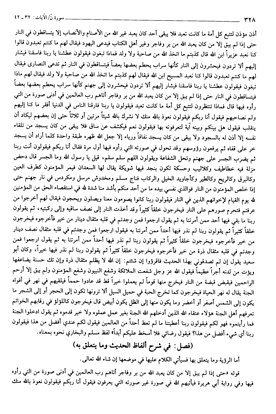 أذن مؤذن لتتبع كل أمة ما كانت تعبد فلا يبقى أحد كان يعبد غير الله من الأصنام والأنصاب إلا يتساقطون في النار حتى إذا لم يبق إلا من كان يعبد الله من بر وفاجر وغير أهل الكتاب فيدعى اليهود فيقال لهم ما كنتم تعبدون قالوا كنا نعبد عزيرا ابن الله قال كذبتم ما اتخذ الله من صاحبة ولا ولد فماذا تبغون فيقولون عطشنا يا ربنا فاسقنا فيشار إليهم ألا تردون فيحشرون إلى النار كأنها سراب يحطم بعضها بعضا فيتساقطون في النار ثم تدعى النصارى فيقال لهم ما كنتم تعبدون قالوا كنا نعبد المسيح ابن الله فيقال لهم كذبتم ما اتخذ الله من صاحبة ولا ولد فيقال لهم ماذا تبغون فيقولون عطشنا يا ربنا فاسقنا فيشار إليهم ألا تردون فيحشرون إلى جهنم كأنها سراب يحطم بعضها بعضا فيتساقطون في النار حتى إذا لم يبق إلا من كان يعبد الله من بر وفاجر أتاهم رب العالمين في أدنى صورة من التي رأوه فيها قال فماذا تنتظرون لتتبع كل أمة ما كانت تعبد فيقولون يا ربنا فارقنا الناس في الدنيا أفقر ما كنا إليهم ولم نصاحبهم فيقول أنا ربكم فيقولون نعوذ بالله منك لا نشرك بالله شيئا مرتين أو ثلاثا حتى إن بعضهم ليكاد أن ينقلب فيقول هل بينكم وبينه آية لتعرفونه بها فيقولون نعم فيكشف عن ساق فلا يبقى من كان يسجد من تلقاء نفسه إلا أذن له بالسجود ولا يبقى من كان يسجد نفاقا ورياء إلا جعل الله ظهره طبقة واحدة كلما أراد أن يسجد خر على قفاه ثم يرفعون رؤوسهم وقد تحول في صورته التي رأوه فيها أول مرة فقال أنا ربكم فيقولون أنت ربنا ثم يضرب الجسر على جهنم وتحل الشفاعة ويقولون اللهم سلم سلم، قيل يا رسول الله وما الجسر قال دحض مزلة فيه خطاطيف وكلاليب وحسكة تكون بنجد فيها شويكة يقال لها السعدان فيمر المؤمنون كطرف العين وكالبرق وكالريح وكالطير وكأجاويد الخيل والركاب فناج مسلم ومخدوش مرسل ومكردس في نار جهنم حتى إذا خلص المؤمنون من النار فو الذي نفسي بيده ما من أحد منكم بأشد منا شدة لله في استقصاء الحق من المؤمنين لله يوم القيام لإخوانهم الذين في النار فيقولون ربنا كانوا يصومون معنا ويصلون ويحجون فيقال لهم أخرجوا من عرفتم فتحرم صورهم على النار فيخرجون خلقا كثيرا وقد أخذت النار إلى نصف ساقيه وإلى ركبتيه، ثم يقولون ربنا ما بقي فيها أحد ممن أمرتنا به ثم يقول ارجعوا فمن وجدتم في قلبه مثقال دينار من خير فأخرجوه فيخرجون خلقا كثيرا ثم يقولون ربنا لم نذر فيها أحدا ممن أمرتنا به فيقول ارجعوا فمن وجدتم في قلبه مثقال نصف دينار من خير فأخرجوه فيخرجون خلقا كثيرا ثم يقولون ربنا لم نذر فيها أحدا ممن أمرتنا به ثم يقول ارجعوا فمن وجدتم في قلبه مثقال ذرة من خير فأخرجوه فيخرجون خلقا كثيرا ثم يقولون ربنا لم نذر فيها خيرا، وكان أبو سعيد يقول إن لم تصدقوني بهذا الحديث فاقرؤوا إن شئتم: إن الله لا يظلم مثقال ذرة وإن تك حسنة يضاعفها ويؤت من لدنه أجرا عظيما فيقول الله عز وجل شفعت الملائكة وشفع النبيون وشفع المؤمنون ولم يبق إلا أرحم الراحمين فيقبض قبضة من النار فيخرج منها قوما لم يعملوا خيرا قط قد عادوا حمما فيلقيهم في نهر في أفواه الجنة يقال له نهر الحياة فيخرجون كما تخرج الحبة في حميل السيل ألا ترونها تكون إلى الحجر أو إلى الشجر ما يكون إلى الشمس أصفر أو أخضر وما يكون منها إلى الظل يكون أبيض قال فيخرجون كاللؤلؤ في رقابهم الخواتم تعرفهم أهل الجنة هؤلاء عتقاء الله الذين أدخلهم الله الجنة بغير عمل عملوه