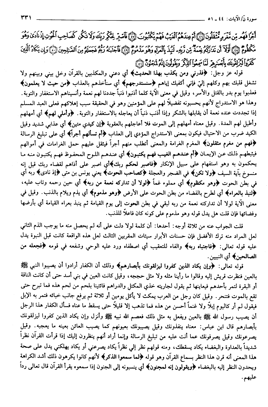 وهذا هو الاستدراج لأنهم يحسبونه تفضيلا لهم على المؤمنين وهو في الحقيقة سبب إهلاكهم فعلى العبد المسلم إذا تجددت عنده نعمة أن يقابلها بالشكر وإذا أذنب ذنبا أن يعاجله بالاستغفار والتوبة. وَأُمْلِي لَهُمْ أي أمهلهم وأطيل لهم المدة. وقيل معناه أمهلهم إلى الموت فلا أعاجلهم بالعقوبة إِنَّ كَيْدِي مَتِينٌ أي عذابي شديد وقيل الكيد ضرب من الاحتيال فيكون بمعنى الاستدراج المؤدي إلى العذاب أَمْ تَسْئَلُهُمْ أَجْراً أي على تبليغ الرسالة فَهُمْ مِنْ مَغْرَمٍ مُثْقَلُونَ المغرم الغرامة والمعنى أتطلب منهم أجرا فيقل عليهم حمل الغرامات في أموالهم فيثبطهم ذلك عن الإيمان أَمْ عِنْدَهُمُ الْغَيْبُ فَهُمْ يَكْتُبُونَ أي عندهم اللوح المحفوظ فهم يكتبون منه ما يحكمون به وهو استفهام على سبيل الإنكار فَاصْبِرْ لِحُكْمِ رَبِّكَ أي اصبر على أذاهم لقضاء ربك قيل إنه منسوخ بآية السيف وَلا تَكُنْ في الضجر والعجلة كَصاحِبِ الْحُوتِ يعني يونس بن متى إِذْ نادى ربه أي في بطن الحوت وَهُوَ مَكْظُومٌ أي مملوء غما لَوْلا أَنْ تَدارَكَهُ نِعْمَةٌ مِنْ رَبِّهِ أي حين رحمه وتاب عليه، لَنُبِذَ بِالْعَراءِ أي لطرح بالفضاء من بطن الحوت على الأرض وَهُوَ مَذْمُومٌ أي يذم ويلام بالذنب. وقيل في معنى الآية لولا أن تداركته نعمة من ربه لبقي في بطن الحوت إلى يوم القيامة ثم ينبذ بعراء القيامة أي بأرضها وفضائها فإن قلت هل يدل قوله وهو مذموم على كونه كان فاعلا للذنب.