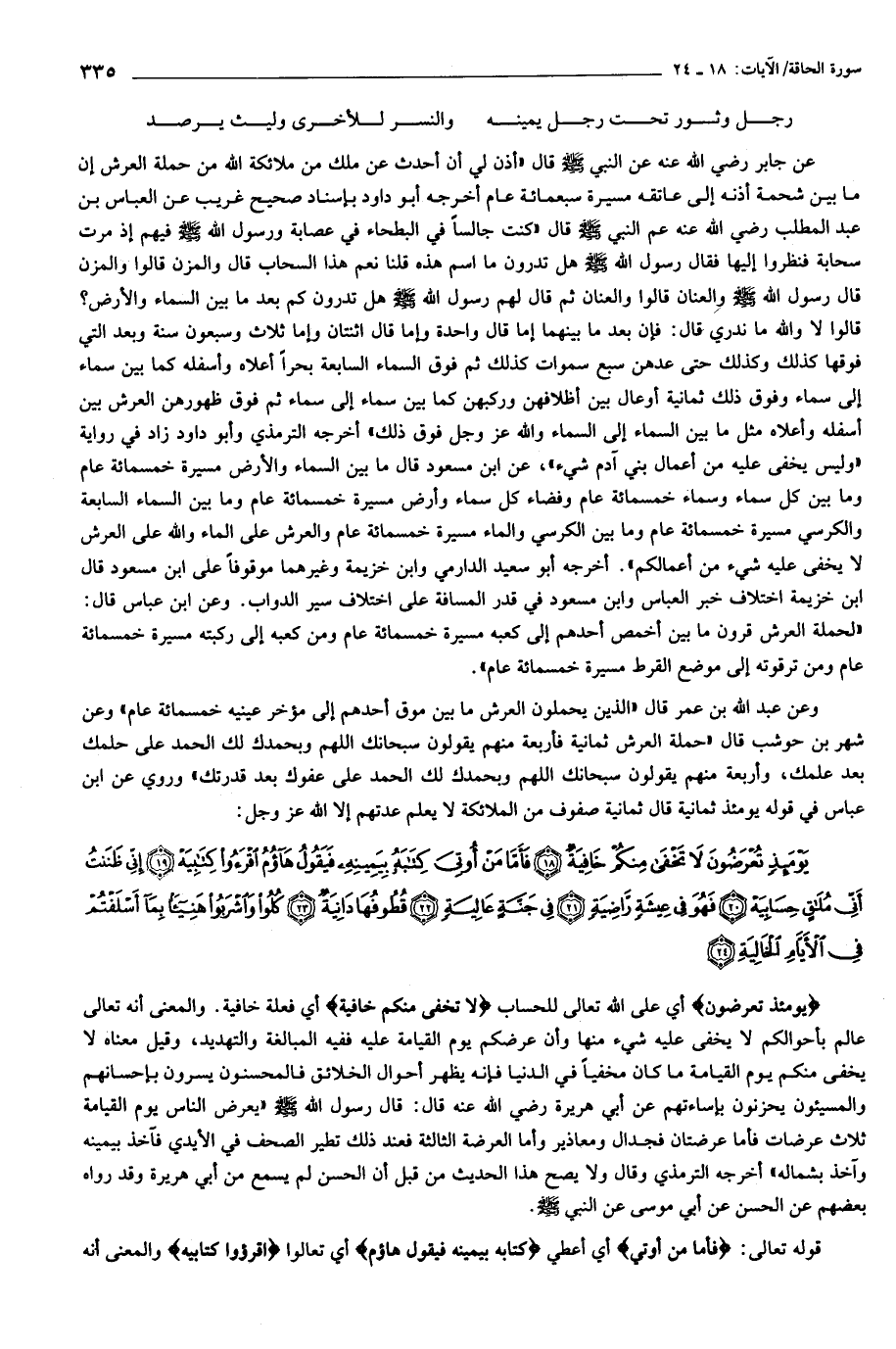 وعن عبد الله بن عمر قال «الذين يحملون العرش ما بين موق أحدهم إلى مؤخر عينيه خمسمائة عام» وعن شهر بن حوشب قال «حملة العرش ثمانية فأربعة منهم يقولون سبحانك اللهم وبحمدك لك الحمد على حلمك بعد علمك، وأربعة منهم يقولون سبحانك اللهم وبحمدك لك الحمد على عفوك بعد قدرتك» وروي عن ابن عباس في قوله يومئذ ثمانية قال ثمانية صفوف من الملائكة لا يعلم عدتهم إلا الله عز وجل: