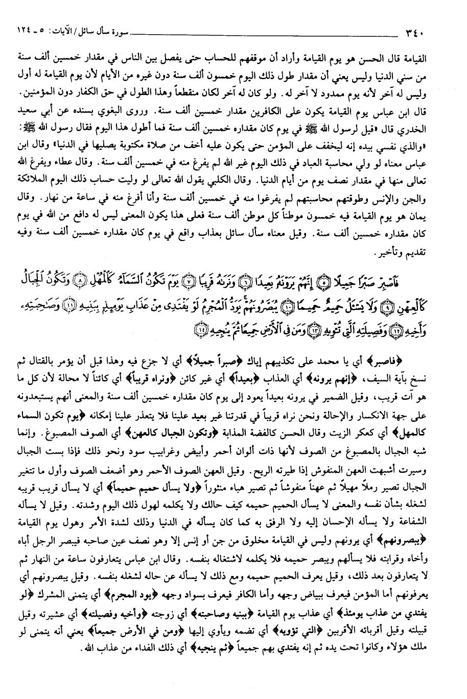 فَاصْبِرْ أي يا محمد على تكذيبهم إياك صَبْراً جَمِيلًا أي لا جزع فيه وهذا قبل أن يؤمر بالقتال ثم نسخ بآية السيف، إِنَّهُمْ يَرَوْنَهُ أي العذاب بَعِيداً أي غير كائن وَنَراهُ قَرِيباً أي كائنا لا محالة لأن كل ما هو آت قريب، وقيل الضمير في يرونه بعيدا يعود إلى يوم كان مقداره خمسين ألف سنة والمعنى أنهم يستبعدونه على جهة الانكسار والإحالة ونحن نراه قريبا في قدرتنا غير بعيد علينا فلا يتعذر علينا إمكانه يَوْمَ تَكُونُ السَّماءُ كَالْمُهْلِ أي كعكر الزيت وقال الحسن كالفضة المذابة وَتَكُونُ الْجِبالُ كَالْعِهْنِ أي الصوف المصبوغ. وإنما شبه الجبال بالمصبوغ من الصوف لأنها ذات ألوان أحمر وأبيض وغرابيب سود ونحو ذلك فإذا بست الجبال وسيرت أشبهت العهن المنفوش إذا طيرته الريح. وقيل العهن الصوف الأحمر وهو أضعف الصوف وأول ما تتغير الجبال تصير رملا مهيلا ثم عهنا منفوشا ثم تصير هباء منثورا وَلا يَسْئَلُ حَمِيمٌ حَمِيماً أي لا يسأل قريب قريبه لشغله بشأن نفسه والمعنى لا يسأل الحميم حميمه كيف حالك ولا يكلمه لهول ذلك اليوم وشدته. وقيل لا يسأله الشفاعة ولا يسأله الإحسان إليه ولا الرفق به كما كان يسأله في الدنيا وذلك لشدة الأمر وهول يوم القيامة يُبَصَّرُونَهُمْ أي يرونهم وليس في القيامة مخلوق من جن أو إنس إلا وهو نصف عين صاحبه فيبصر الرجل أباه وأخاه وقرابته فلا يسألهم ويبصر حميمه فلا يكلمه لاشتغاله بنفسه. وقال ابن عباس يتعارفون ساعة من النهار ثم لا يتعارفون بعد ذلك، وقيل يعرف الحميم حميمه ومع ذلك لا يسأله عن حاله لشغله بنفسه. وقيل يبصرونهم أي يعرفونهم أما المؤمن فيعرف ببياض وجهه وأما الكافر فيعرف بسواد وجهه يَوَدُّ الْمُجْرِمُ أي يتمنى المشرك لَوْ يَفْتَدِي مِنْ عَذابِ يَوْمِئِذٍ أي عذاب يوم القيامة بِبَنِيهِ وَصاحِبَتِهِ أي زوجته وَأَخِيهِ وَفَصِيلَتِهِ أي عشيرته وقيل قبيلته وقيل أقربائه الأقربين الَّتِي تُؤْوِيهِ أي تضمه ويأوي إليها وَمَنْ فِي الْأَرْضِ جَمِيعاً يعني أنه يتمنى لو ملك هؤلاء وكانوا تحت يده ثم إنه يفتدي بهم جميعا ثُمَّ يُنْجِيهِ أي ذلك الفداء من عذاب الله.