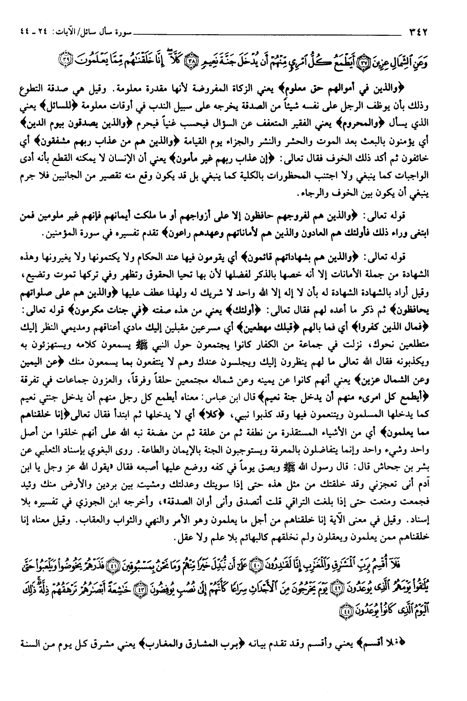 وَالَّذِينَ فِي أَمْوالِهِمْ حَقٌّ مَعْلُومٌ يعني الزكاة المفروضة لأنها مقدرة معلومة. وقيل هي صدقة التطوع وذلك بأن يوظف الرجل على نفسه شيئا من الصدقة يخرجه على سبيل الندب في أوقات معلومة لِلسَّائِلِ يعني الذي يسأل وَالْمَحْرُومِ يعني الفقير المتعفف عن السؤال فيحسب غنيا فيحرم وَالَّذِينَ يُصَدِّقُونَ بِيَوْمِ الدِّينِ أي يؤمنون بالبعث بعد الموت والحشر والنشر والجزاء يوم القيامة وَالَّذِينَ هُمْ مِنْ عَذابِ رَبِّهِمْ مُشْفِقُونَ أي خائفون ثم أكد ذلك الخوف فقال تعالى: إِنَّ عَذابَ رَبِّهِمْ غَيْرُ مَأْمُونٍ يعني أن الإنسان لا يمكنه القطع بأنه أدى الواجبات كما ينبغي ولا اجتنب المحظورات بالكلية كما ينبغي بل قد يكون وقع منه تقصير من الجانبين فلا جرم ينبغي أن يكون بين الخوف والرجاء.