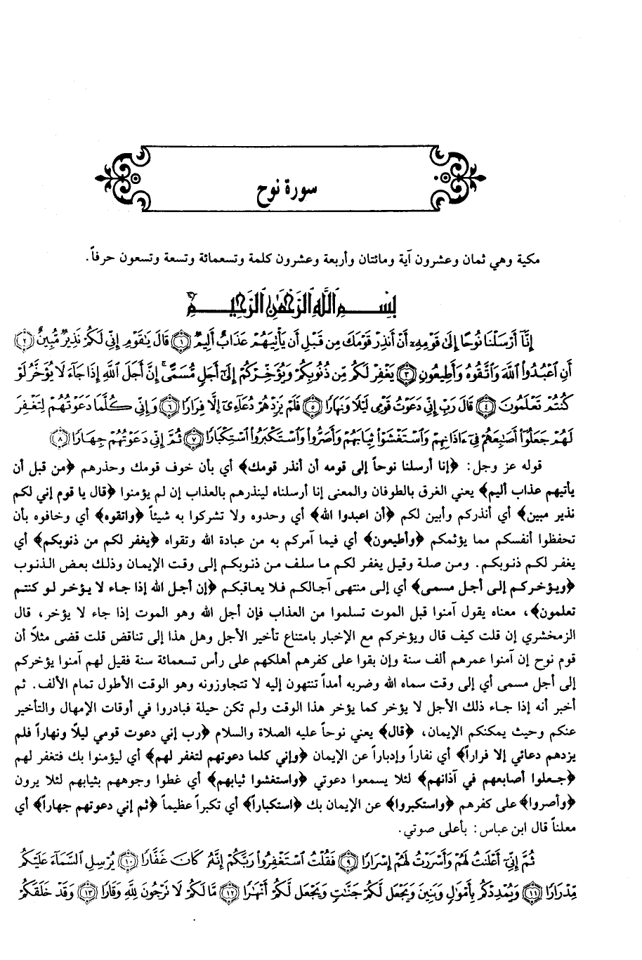 إِنَّا أَرْسَلْنا نُوحاً إِلى قَوْمِهِ أَنْ أَنْذِرْ قَوْمَكَ مِنْ قَبْلِ أَنْ يَأْتِيَهُمْ عَذابٌ أَلِيمٌ (1) قالَ يا قَوْمِ إِنِّي لَكُمْ نَذِيرٌ مُبِينٌ (2) أَنِ اعْبُدُوا اللَّهَ وَاتَّقُوهُ وَأَطِيعُونِ (3) يَغْفِرْ لَكُمْ مِنْ ذُنُوبِكُمْ وَيُؤَخِّرْكُمْ إِلى أَجَلٍ مُسَمًّى إِنَّ أَجَلَ اللَّهِ إِذا جاءَ لا يُؤَخَّرُ لَوْ كُنْتُمْ تَعْلَمُونَ (4)