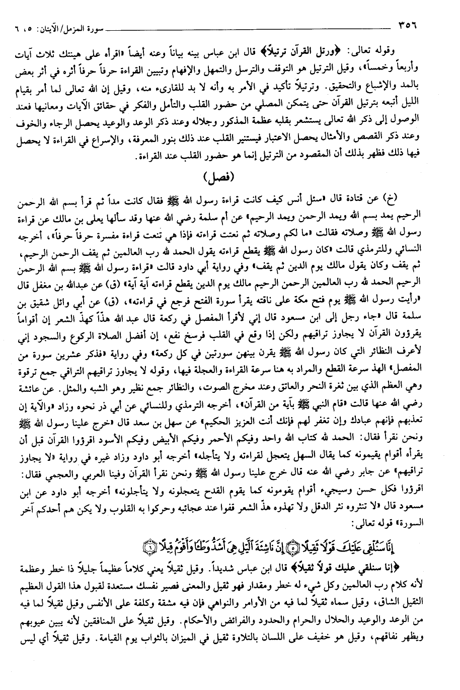 وقوله تعالى: وَرَتِّلِ الْقُرْآنَ تَرْتِيلًا قال ابن عباس بينه بيانا وعنه أيضا «اقرأه على هينتك ثلاث آيات وأربعا وخمسا»، وقيل الترتيل هو التوقف والترسل والتمهل والإفهام وتبيين القراءة حرفا حرفا أثره في أثر بعض بالمد والإشباع والتحقيق. وترتيلا تأكيد في الأمر به وأنه لا بد للقارئ منه، وقيل إن الله تعالى لما أمر بقيام الليل أتبعه بترتيل القرآن حتى يتمكن المصلي من حضور القلب والتأمل والفكر في حقائق الآيات ومعانيها فعند الوصول إلى ذكر الله تعالى يستشعر بقلبه عظمة المذكور وجلاله وعند ذكر الوعد والوعيد يحصل الرجاء والخوف وعند ذكر القصص والأمثال يحصل الاعتبار فيستنير القلب عند ذلك بنور المعرفة، والإسراع في القراءة لا يحصل فيها ذلك فظهر بذلك أن المقصود من الترتيل إنما هو حضور القلب عند القراءة.