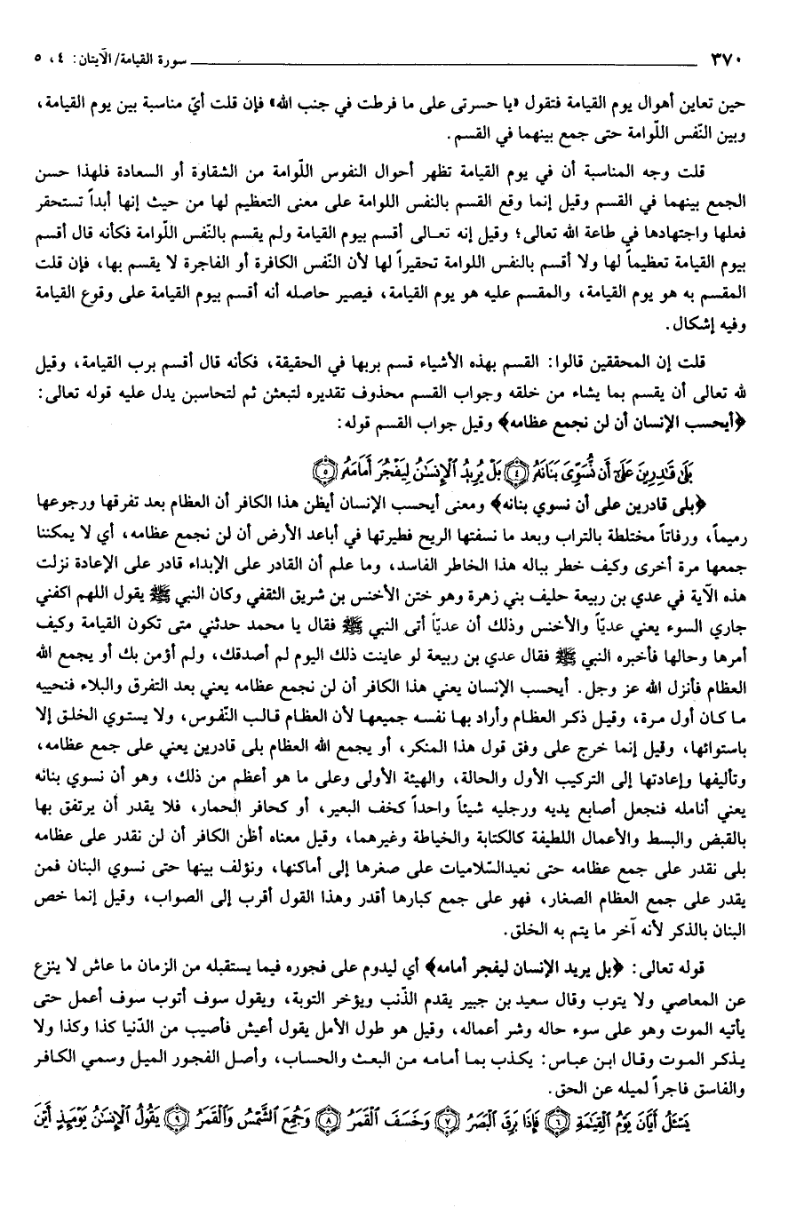 قوله تعالى: بَلْ يُرِيدُ الْإِنْسانُ لِيَفْجُرَ أَمامَهُ أي ليدوم على فجوره فيما يستقبله من الزمان ما عاش لا ينزع عن المعاصي ولا يتوب وقال سعيد بن جبير يقدم الذّنب ويؤخر التوبة، ويقول سوف أتوب سوف أعمل حتى يأتيه الموت وهو على سوء حاله وشر أعماله، وقيل هو طول الأمل يقول أعيش فأصيب من الدّنيا كذا وكذا ولا يذكر الموت وقال ابن عباس: يكذب بما أمامه من البعث والحساب، وأصل الفجور الميل وسمي الكافر والفاسق فاجرا لميله عن الحق.