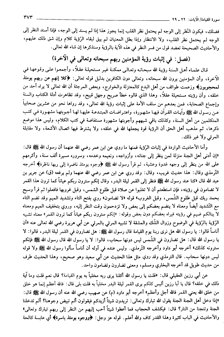 «إن أدنى أهل الجنة منزلة لمن ينظر إلى جنانه، وأزواجه، ونعيمه وخدمه، وسروره مسيرة ألف سنة، وأكرمهم على الله من ينظر إلى وجهه غدوة وعشية، ثم قرأ رسول الله صلّى الله عليه وسلّم وُجُوهٌ يَوْمَئِذٍ ناضِرَةٌ إِلى رَبِّها ناظِرَةٌ أخرجه التّرمذي وقال: هذا حديث غريب، وقال: وقد روي عن ابن عمر رضي الله عنهما ولم يرفعه (ق) عن جرير بن عبد الله قال «كنا عند رسول الله صلّى الله عليه وسلّم فنظر إلى القمر ليلة البدر، وقال إنكم سترون ربكم عيانا كما ترون هذا القمر لا تضامون في رؤيته، فإن استطعتم أن لا تغلبوا عن صلاة قبل طلوع الشمس، وقبل غروبها فافعلوا ثم قرأ وسبح بحمد ربك قبل طلوع الشّمس، وقبل الغروب» قوله «لا تضامون» روي بفتح التاء وتشديد الميم وقد تضم التاء مع التّشديد أيضا ومعناه لا ينضم بعضكم إلى بعض ولا تزدحمون وقت النظر إليه، وروي بتخفيف الميم ومعناه لا ينالكم ضيم في رؤيته فيراه بعضكم دون بعض وقوله: «إنكم سترون ربكم عيانا كما ترون القمر» معناه تشبيه الرّؤية بالرّؤية في الوضوح وزوال الشّك والمشقة لا تشبيه المرئي بالمرئي عن أبي هريرة رضي الله تعالى عنه «أن أناسا قالوا: يا رسول الله هل نرى ربنا يوم القيامة قال رسول الله صلّى الله عليه وسلّم: هل تضارون في القمر ليلة البدر، قالوا: لا يا رسول الله قال: هل تضارون في الشّمس ليس دونها سحاب، قالوا: لا يا رسول الله قال رسول الله صلّى الله عليه وسلّم فإنكم سترونه كذلك» أخرجه أبو داود وأخرجه التّرمذي. وليس عنده في أوله أن أناسا سألوا رسول الله صلّى الله عليه وسلّم ولا قوله ليس دونها سحاب. قال الترمذي وقد روي مثل هذا الحديث عن أبي سعيد وهو صحيح، وهذا الحديث طرف من حديث طويل قد أخرجه البخاري ومسلم، ومعنى تضارون وتضامون واحد.