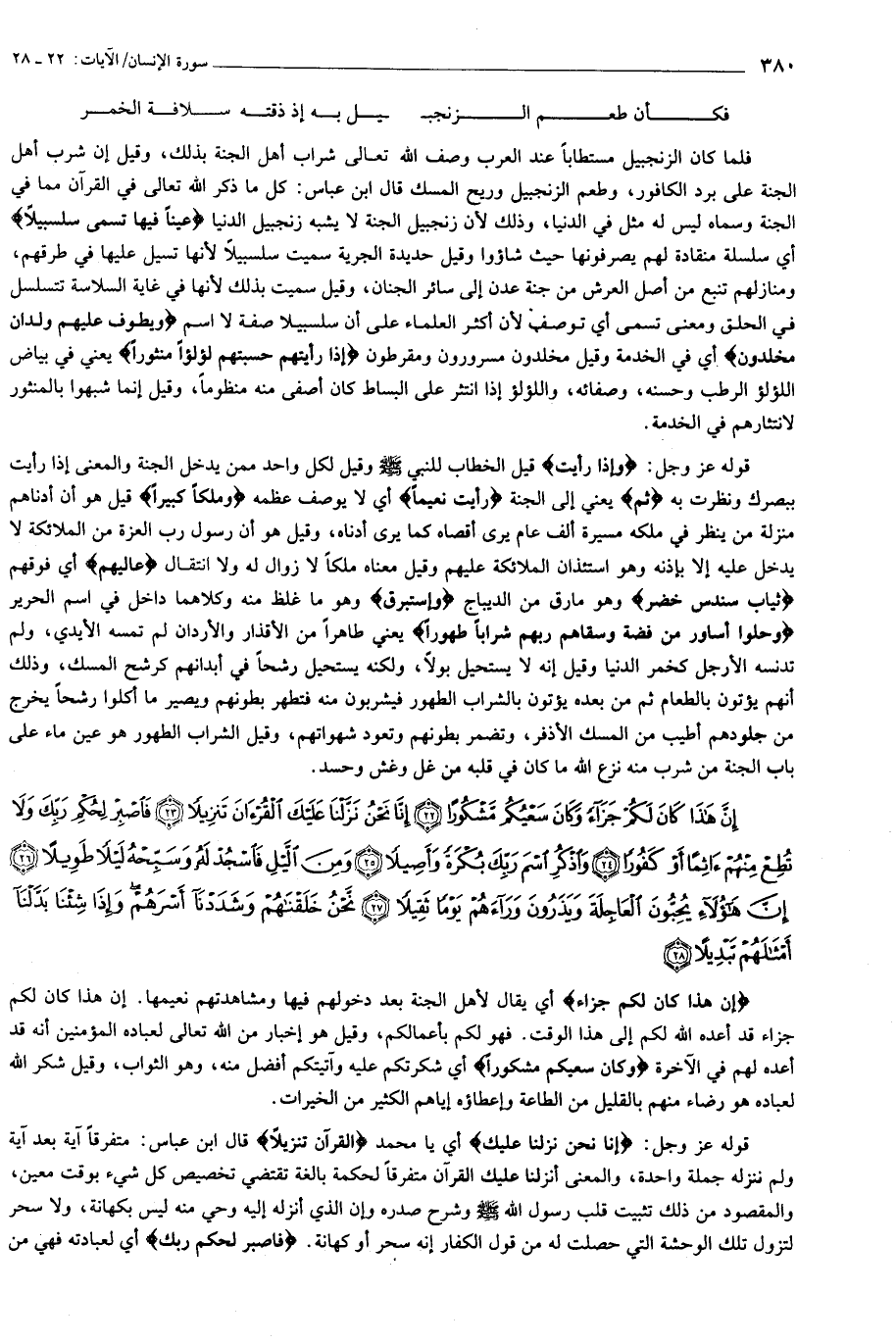 إِنَّ هذا كانَ لَكُمْ جَزاءً وَكانَ سَعْيُكُمْ مَشْكُوراً (22) إِنَّا نَحْنُ نَزَّلْنا عَلَيْكَ الْقُرْآنَ تَنْزِيلاً (23) فَاصْبِرْ لِحُكْمِ رَبِّكَ وَلا تُطِعْ مِنْهُمْ آثِماً أَوْ كَفُوراً (24) وَاذْكُرِ اسْمَ رَبِّكَ بُكْرَةً وَأَصِيلاً (25) وَمِنَ اللَّيْلِ فَاسْجُدْ لَهُ وَسَبِّحْهُ لَيْلاً طَوِيلاً (26)