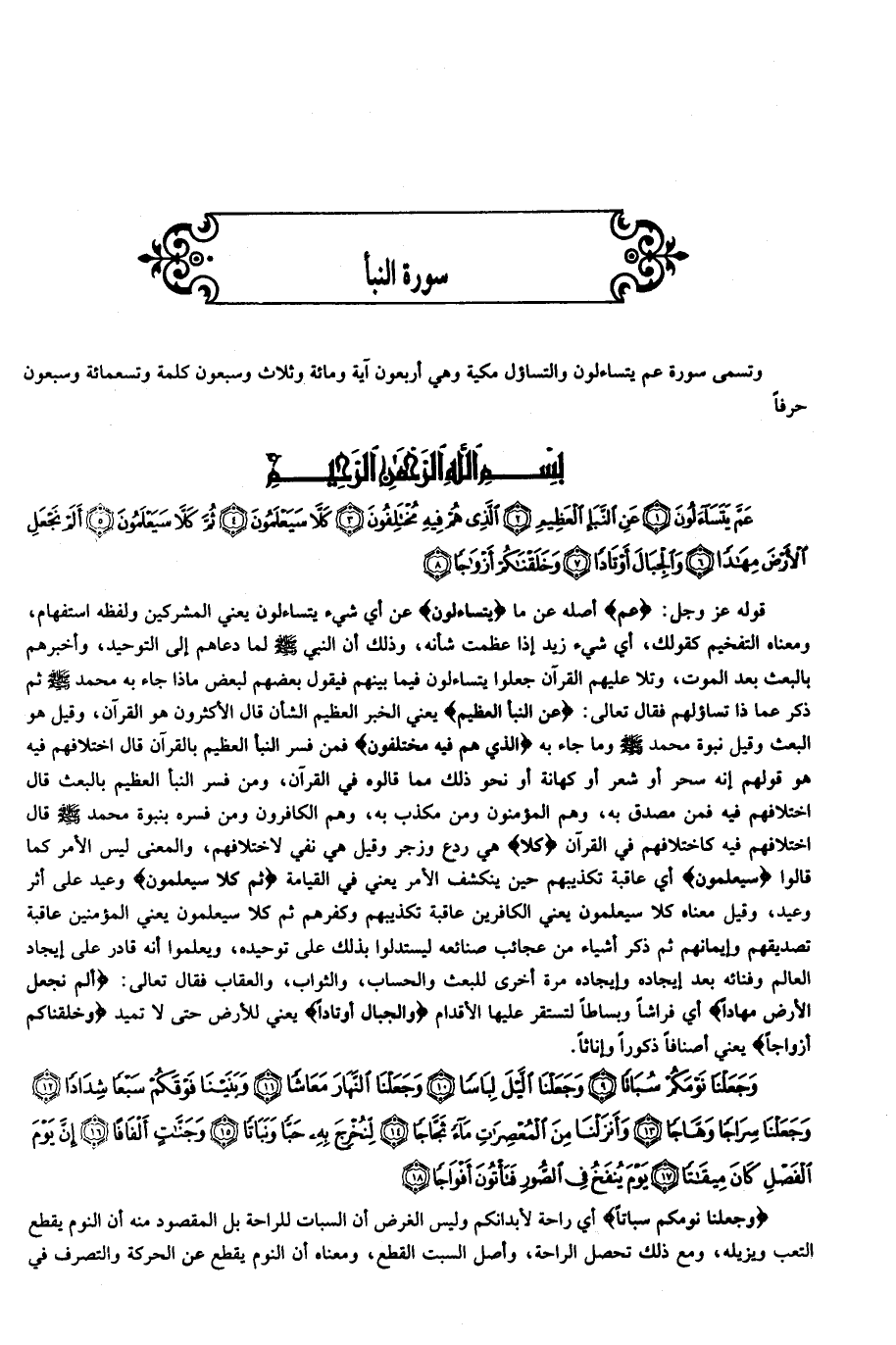 وتسمى سورة عم يتساءلون والتساؤل مكية وهي أربعون آية ومائة وثلاث وسبعون كلمة وتسعمائة وسبعون حرفا بسم الله الرّحمن الرّحيم