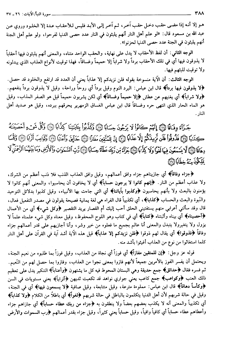 ثم فسره فقال حَدائِقَ جمع حديقة وهي البستان المحوط فيه كل ما يشتهون وَأَعْناباً التنكير يدل على تعظيم ذلك العنب وَكَواعِبَ جمع كاعب يعني جواري نواهد قد تكعبت ثديهن أَتْراباً يعني مستويات في السن وَكَأْساً دِهاقاً قال ابن عباس: مملوءة مترعة، وقيل متتابعة، وقيل صافية لا يَسْمَعُونَ فِيها أي في الجنة، وقيل في حالة شربهم لأن أهل الدنيا يتكلمون بالباطل في حالة شربهم لَغْواً أي باطلا من الكلام وَلا كِذَّاباً أي تكذيبا والمعنى أنه لا يكذب بعضهم بعضا ولا ينطقون به جَزاءً مِنْ رَبِّكَ عَطاءً حِساباً أي جازاهم جزاء وأعطاهم عطاء حسابا أي كافيا وافيا، وقيل حسابا يعني كثيرا، وقيل جزاء بقدر أعمالهم رَبِّ السَّماواتِ وَالْأَرْضِ
