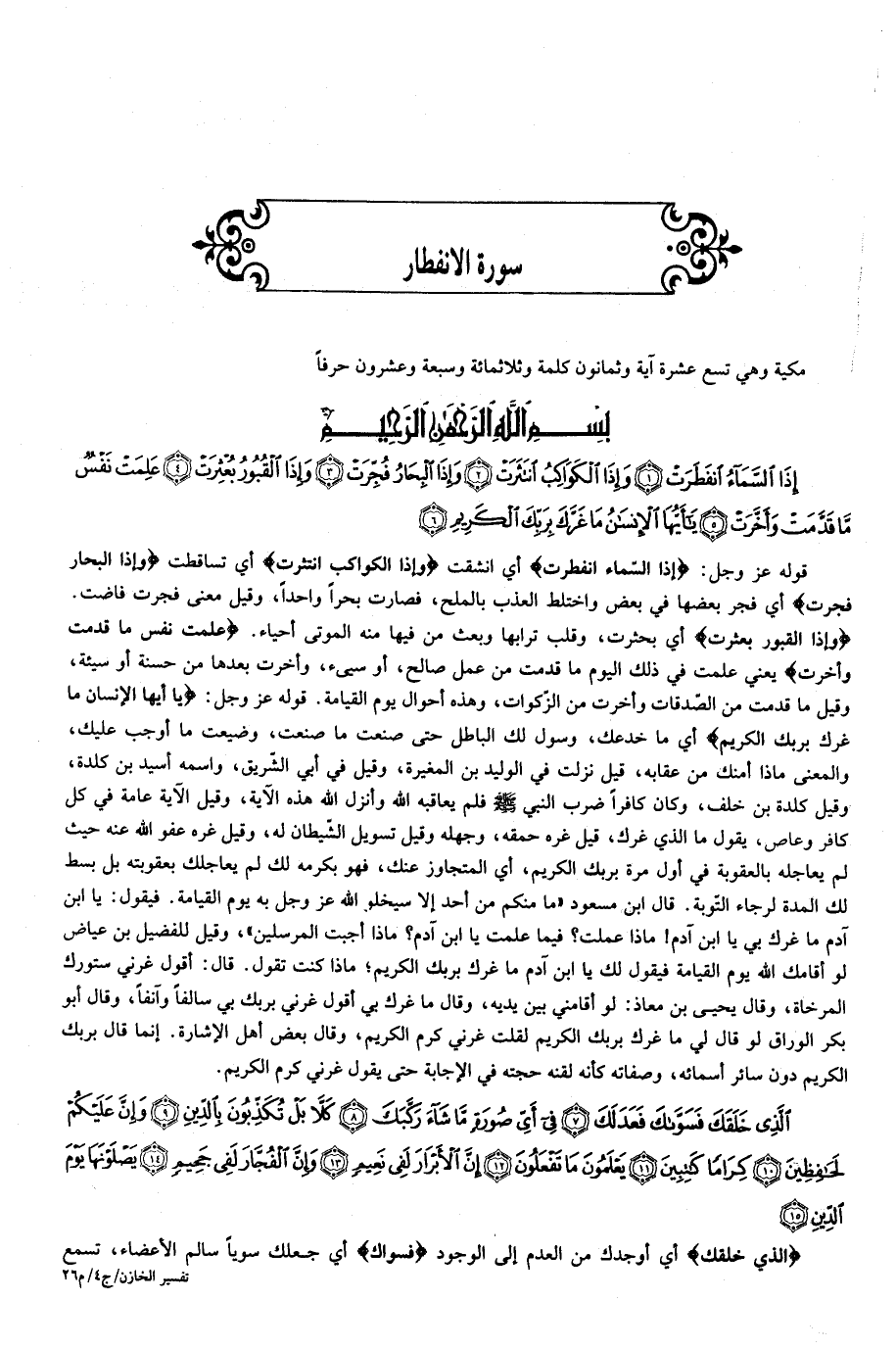 إِذَا السَّماءُ انْفَطَرَتْ (1) وَإِذَا الْكَواكِبُ انْتَثَرَتْ (2) وَإِذَا الْبِحارُ فُجِّرَتْ (3) وَإِذَا الْقُبُورُ بُعْثِرَتْ (4)