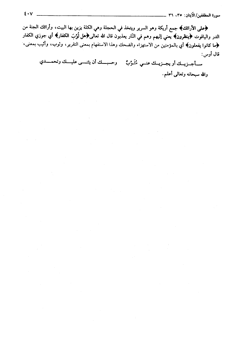 عَلَى الْأَرائِكِ جمع أريكة وهو السرير ويتخذ في الحجلة وهي الكلة يزين بها البيت، وأرائك الجنة من الدر والياقوت يَنْظُرُونَ يعني إليهم وهم في النّار يعذبون قال الله تعالى هَلْ ثُوِّبَ الْكُفَّارُ أي جوزي الكفار ما كانُوا يَفْعَلُونَ أي بالمؤمنين من الاستهزاء والضحك وهذا الاستفهام بمعنى التقرير، وثوب، وأثيب بمعنى، قال أوس: