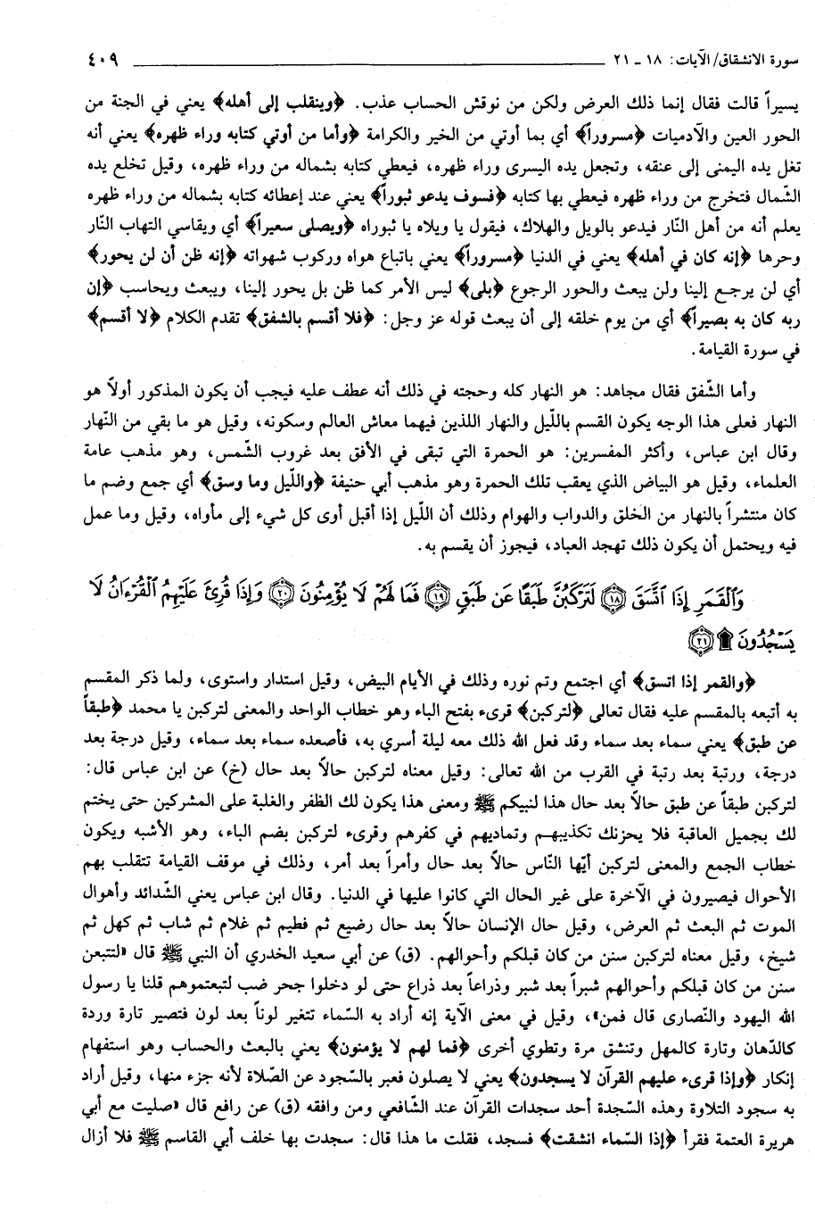وَالْقَمَرِ إِذَا اتَّسَقَ (18) لَتَرْكَبُنَّ طَبَقاً عَنْ طَبَقٍ (19) فَما لَهُمْ لا يُؤْمِنُونَ (20) وَإِذا قُرِئَ عَلَيْهِمُ الْقُرْآنُ لا يَسْجُدُونَ (21)