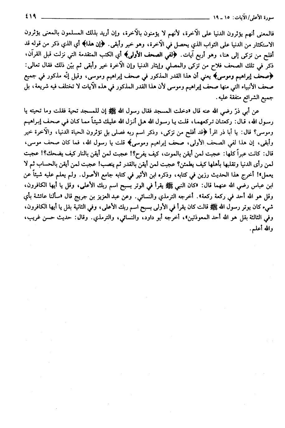 عن أبي ذرّ رضي الله عنه قال «دخلت المسجد فقال رسول الله صلّى الله عليه وسلّم إن للمسجد تحية فقلت وما تحيته يا رسول الله، قال: ركعتان تركعهما، قلت يا رسول الله هل أنزل الله عليك شيئا مما كان في صحف إبراهيم وموسى؟ قال: يا أبا ذر اقرأ قَدْ أَفْلَحَ مَنْ تَزَكَّى، وَذَكَرَ اسْمَ رَبِّهِ فَصَلَّى بَلْ تُؤْثِرُونَ الْحَياةَ الدُّنْيا، وَالْآخِرَةُ خَيْرٌ وَأَبْقى، إِنَّ هذا لَفِي الصُّحُفِ الْأُولى، صُحُفِ إِبْراهِيمَ وَمُوسى قلت يا رسول الله، فما كان صحف موسى، قال: كانت عبرا كلها: عجبت لمن أيقن بالموت، كيف يفرح؟! عجبت لمن أيقن بالنار كيف يضحك؟! عجبت لمن رأى الدنيا وتقلبها بأهلها كيف يطمئن؟ عجبت لمن أيقن بالقدر ثم ينصب! عجبت لمن أيقن بالحساب ثم لا يعمل»! أخرج هذا الحديث رزين في كتابه، وذكره ابن الأثير في كتابه جامع الأصول. ولم يعلم عليه شيئا عن ابن عباس رضي الله عنهما قال: «كان النبي صلّى الله عليه وسلّم يقرأ في الوتر بسبح اسم ربك الأعلى، وقل يا أيها الكافرون، وقل هو الله أحد في ركعة ركعة». أخرجه الترمذي والنسائي. وعن عبد العزيز بن جريج قال «سألنا عائشة بأي شيء كان يوتر رسول الله صلّى الله عليه وسلّم قالت كان يقرأ في الأولى بسبح اسم ربك الأعلى، وفي الثانية بقل يا أيها الكافرون، وفي الثالثة بقل هو الله أحد المعوذتين»، أخرجه أبو داود، والنسائي، والترمذي. وقال: حديث حسن غريب، والله أعلم.
