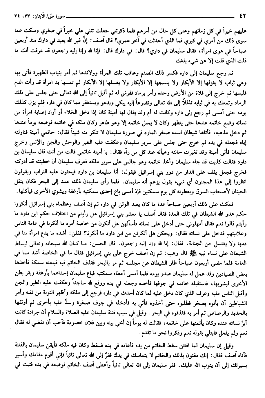 فمكث على ذلك أربعين صباحا عدة ما كان يعبد الوثن في داره ثم إن آصف وعظماء بني إسرائيل أنكروا حكم عدو الله الشيطان في تلك المدة فقال آصف يا معشر بني إسرائيل هل رأيتم من اختلاف حكم ابن داود ما رأيتم قالوا نعم فقال أمهلوني حتى أدخل على نسائه فأسألهن هل أنكرن من خاصة أمره ما أنكرنا في عامة الناس وعلانيتهم فدخل على نسائه فقال: ويحكن هل أنكرتن من ابن داود ما أنكرنا؟ فقلن: أشده ما يدع امرأة منا في دمها ولا يغتسل من الجنابة، فقال: إنا لله وإنا إليه راجعون. قال الحسن: ما كان الله سبحانه وتعالى ليسلط الشيطان على نساء نبيه صلّى الله عليه وسلّم قال وهب: ثم إن آصف خرج على بني إسرائيل فقال ما في الخاصة أشد مما في العامة فلما مضى أربعون صباحا طار الشيطان عن مجلسه ثم مر بالبحر فقذف الخاتم فيه فبلعته سمكة فأخذها بعض الصيادين وقد عمل له سليمان صدر يومه فلما أمسى أعطاه سمكتيه فباع سليمان إحداهما بأرغفة وبقر بطن الأخرى ليشويها، فاستقبله خاتمه في جوفها فأخذه وجعله في يده ووقع لله ساجدا وعكفت عليه الطير والجن وأقبل الناس عليه وعرف الذي كان دخل عليه لما كان أحدث في داره فرجع إلى ملكه وأظهر التوبة من ذنبه وأمر الشياطين أن يأتوه بصخر فطلبوه حتى أخذوه فأتي به فأدخله في جوف صخرة وسدّ عليه بأخرى ثم أوثقها بالحديد والرصاص ثم أمر به فقذفوه في البحر. وقيل في سبب فتنة سليمان عليه الصلاة والسلام أن جرادة كانت أبرّ نسائه عنده وكان يأتمنها على خاتمه، فقالت له يوما إن أخي بينه وبين فلان خصومة فأحب أن تقضي له فقال نعم ولم يفعل فابتلي بقوله نعم وذكروا نحو ما تقدم.