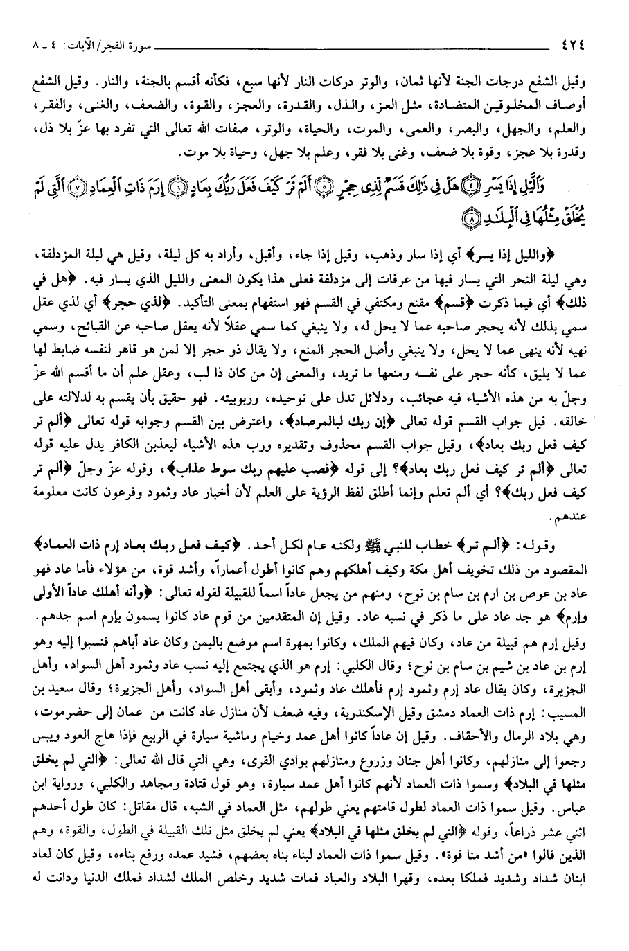 وَاللَّيْلِ إِذا يَسْرِ (4) هَلْ فِي ذلِكَ قَسَمٌ لِذِي حِجْرٍ (5) أَلَمْ تَرَ كَيْفَ فَعَلَ رَبُّكَ بِعادٍ (6) إِرَمَ ذاتِ الْعِمادِ (7) الَّتِي لَمْ يُخْلَقْ مِثْلُها فِي الْبِلادِ (8)