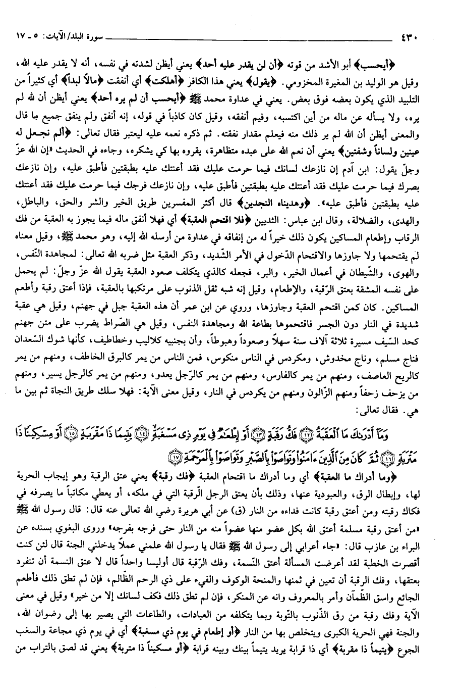 أَيَحْسَبُ أبو الأشد من قوته أَنْ لَنْ يَقْدِرَ عَلَيْهِ أَحَدٌ يعني أيظن لشدته في نفسه، أنه لا يقدر عليه الله، وقيل هو الوليد بن المغيرة المخزومي. يَقُولُ يعني هذا الكافر أَهْلَكْتُ أي أنفقت مالًا لُبَداً أي كثيرا من التلبيد الذي يكون بعضه فوق بعض. يعني في عداوة محمد صلّى الله عليه وسلّم أَيَحْسَبُ أَنْ لَمْ يَرَهُ أَحَدٌ يعني أيظن أن لله لم يره، ولا يسأله عن ماله من أين اكتسبه، وفيم أنفقه، وقيل كان كاذبا في قوله، إنه أنفق ولم ينفق جميع ما قال والمعنى أيظن أن الله لم ير ذلك منه فيعلم مقدار نفقته. ثم ذكره نعمه عليه ليعتبر فقال تعالى: أَلَمْ نَجْعَلْ لَهُ عَيْنَيْنِ وَلِساناً وَشَفَتَيْنِ يعني أن نعم الله على عبده متظاهرة، يقروه بها كي يشكره، وجاءه في الحديث «إن الله عزّ وجلّ يقول: ابن آدم إن نازعك لسانك فيما حرمت عليك فقد أعنتك عليه بطبقتين فأطبق عليه، وإن نازعك بصرك فيما حرمت عليك فقد أعنتك عليه بطبقتين فأطبق عليه، وإن نازعك فرجك فيما حرمت عليك فقد أعنتك عليه بطبقتين فأطبق عليه». وَهَدَيْناهُ النَّجْدَيْنِ قال أكثر المفسرين طريق الخير والشر والحق، والباطل، والهدى، والضلالة، وقال ابن عباس: الثديين فَلَا اقْتَحَمَ الْعَقَبَةَ أي فهلا أنفق ماله فيما يجوز به العقبة من فك الرقاب وإطعام المساكين يكون ذلك خيرا له من إنفاقه في عداوة من أرسله الله إليه، وهو محمد صلّى الله عليه وسلّم، وقيل معناه لم يقتحمها ولا جاوزها والاقتحام الدّخول في الأمر الشّديد، وذكر العقبة مثل ضربه الله تعالى: لمجاهدة النّفس، والهوى، والشّيطان في أعمال الخير، والبر، فجعله كالذي يتكلف صعود العقبة يقول الله عزّ وجلّ: لم يحمل على نفسه المشقة بعتق الرّقبة، والإطعام، وقيل إنه شبه ثقل الذنوب على مرتكبها بالعقبة، فإذا أعتق رقبة وأطعم المساكين. كان كمن اقتحم العقبة وجاوزها، وروي عن ابن عمر أن هذه العقبة جبل في جهنم، وقيل هي عقبة شديدة في النار دون الجسر فاقتحموها بطاعة الله ومجاهدة النفس، وقيل هي الصّراط يضرب على متن جهنم كحد السّيف مسيرة ثلاثة آلاف سنة سهلا وصعودا وهبوطا، وأن بجنبيه كلاليب وخطاطيف، كأنها شوك السّعدان فناج مسلم، وناج مخدوش، ومكردس في الناس منكوس، فمن الناس من يمر كالبرق الخاطف، ومنهم من يمر كالريح العاصف، ومنهم من يمر كالفارس، ومنهم من يمر كالرّجل يعدو، ومنهم من يمر كالرجل يسير، ومنهم من يزحف زحفا ومنهم الزّالون ومنهم من يكردس في النار، وقيل معنى الآية: فهلا سلك طريق النجاة ثم بين ما هي. فقال تعالى: