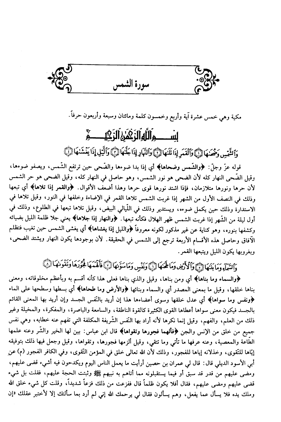 قوله عزّ وجلّ: وَالشَّمْسِ وَضُحاها أي إذا بدا ضوءها والضّحى حين ترتفع الشّمس، ويصفو ضوءها، وقيل الضّحى النهار كله لأن الضحى هو نور الشمس، وهو حاصل في النهار كله، وقيل الضحى هو حر الشمس لأن حرها ونورها متلازمان، فإذا اشتد نورها قوى حرها وهذا أضعف الأقوال. وَالْقَمَرِ إِذا تَلاها أي تبعها وذلك في النصف الأول من الشهر إذا غربت الشمس تلاها القمر في الإضاءة وخلفها في النور، وقيل تلاها في الاستدارة وذلك حين يكمل ضوءه، ويستدير وذلك في اللّيالي البيض، وقيل تلاها تبعها في الطلوع، وذلك في أول ليلة من الشّهر إذا غربت الشمس ظهر الهلال فكأنه تبعها. وَالنَّهارِ إِذا جَلَّاها يعني جلا ظلمة الليل بضيائه وكشفها بنوره، وهو كناية عن غير مذكور لكونه معروفا وَاللَّيْلِ إِذا يَغْشاها أي يغشى الشمس حين تغيب فتظلم الآفاق وحاصل هذه الأقسام الأربعة ترجع إلى الشمس في الحقيقة. لأن بوجودها يكون النهار ويشتد الضحى، وبغروبها يكون الليل ويتبعها القمر.