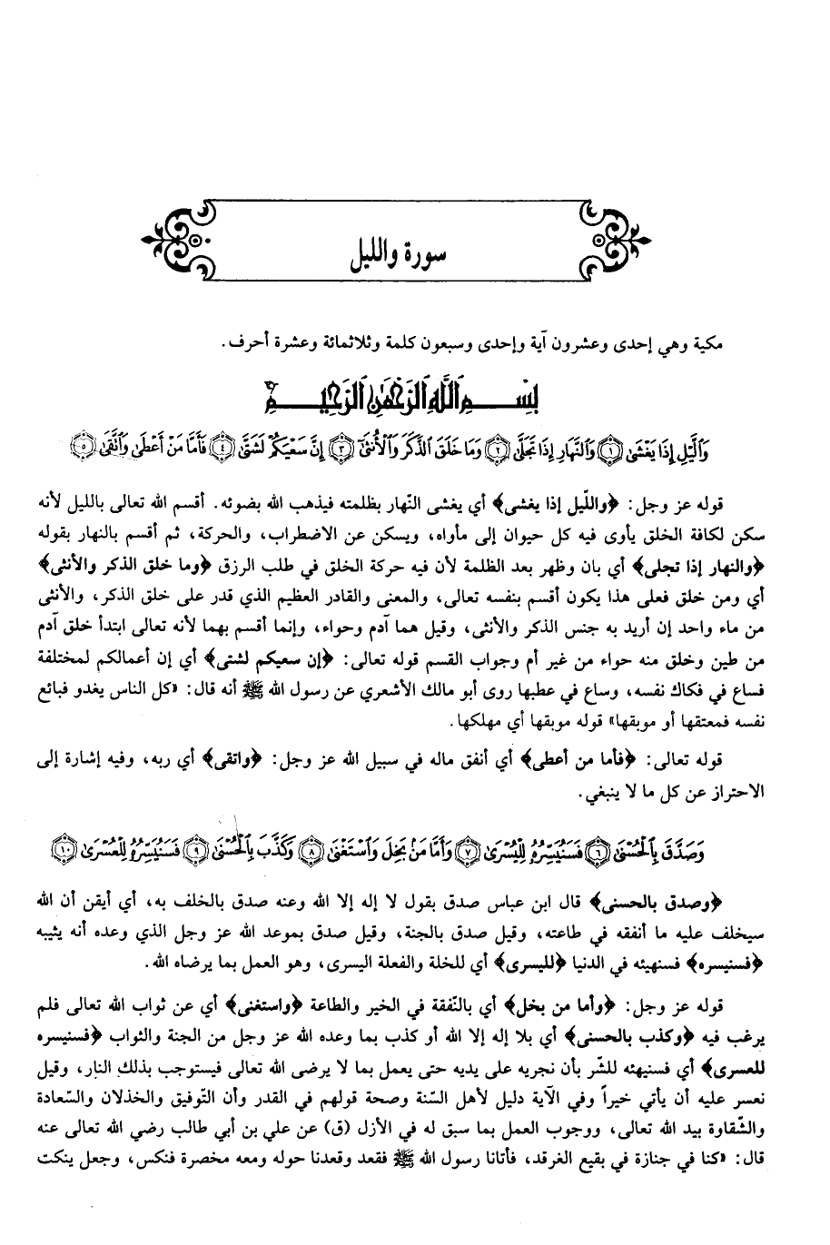 قوله عز وجل: وَاللَّيْلِ إِذا يَغْشى أي يغشى النّهار بظلمته فيذهب الله بضوئه. أقسم الله تعالى بالليل لأنه سكن لكافة الخلق يأوى فيه كل حيوان إلى مأواه، ويسكن عن الاضطراب، والحركة، ثم أقسم بالنهار بقوله وَالنَّهارِ إِذا تَجَلَّى أي بان وظهر بعد الظلمة لأن فيه حركة الخلق في طلب الرزق وَما خَلَقَ الذَّكَرَ وَالْأُنْثى أي ومن خلق فعلى هذا يكون أقسم بنفسه تعالى، والمعنى والقادر العظيم الذي قدر على خلق الذكر، والأنثى من ماء واحد إن أريد به جنس الذكر والأنثى، وقيل هما آدم وحواء، وإنما أقسم بهما لأنه تعالى ابتدأ خلق آدم من طين وخلق منه حواء من غير أم وجواب القسم قوله تعالى: إِنَّ سَعْيَكُمْ لَشَتَّى أي إن أعمالكم لمختلفة فساع في فكاك نفسه، وساع في عطبها روى أبو مالك الأشعري عن رسول الله صلّى الله عليه وسلّم أنه قال: «كل الناس يغدو فبائع نفسه فمعتقها أو موبقها» قوله موبقها أي مهلكها.