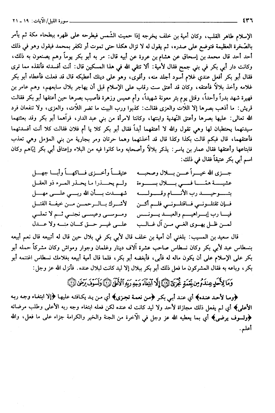 الإسلام طاهر القلب، وكان أمية بن خلف يخرجه إذا حميت الشّمس فيطرحه على ظهره ببطحاء مكة ثم يأمر بالصّخرة العظيمة فتوضع على صدره، ثم يقول له لا تزال هكذا حتى تموت أو تكفر بمحمد فيقول وهو في ذلك أحد أحد قال محمد بن إسحاق عن هشام بن عروة عن أبيه قال: مر به أبو بكر يوما وهم يصنعون به ذلك، وكانت دار أبي بكر في بني جمح فقال لأمية: ألا تتقي الله في هذا المسكين قال: أنت أفسدته فأنقذه مما ترى فقال أبو بكر أفعل عندي غلام أسود أجلد منه، وأقوى، وهو على دينك أعطيكه قال قد فعلت فأعطاه أبو بكر غلامه وأخذ بلالا فأعتقه، وكان قد أعتق ست رقاب على الإسلام قبل أن يهاجر بلال سابعهم، وهم عامر بن فهيرة شهد بدرا وأحدا، وقتل يوم بئر معونة شهيدا، وأم عميس وزهرة فأصيب بصرها حين أعتقها أبو بكر فقالت قريش: ما أذهب بصرها إلا اللات والعزى فقالت: كذبوا ورب البيت ما تضر اللّات، والعزى، ولا تنفعان فرد الله تعالى: عليها بصرها وأعتق النّهدية وابنتها، وكانتا لامرأة من بني عبد الدار، فرآهما أبو بكر وقد بعثتهما سيدتهما يحتطبان لها وهي تقول والله لا أعتقهما أبدا فقال أبو بكر كلا يا أم فلان فقالت كلا أنت أفسدتهما فأعتقهما، قال فبكم قالت بكذا وكذا قال قد أخذتهما وهما حرتان ومر بجارية من بني المؤمل وهي تعذب فابتاعها وأعتقها فقال عمار بن ياسر: يذكر بلالا وأصحابه وما كانوا فيه من البلاء وإعتاق أبي بكر إيّاهم وكان اسم أبي بكر عتيقا فقال في ذلك: