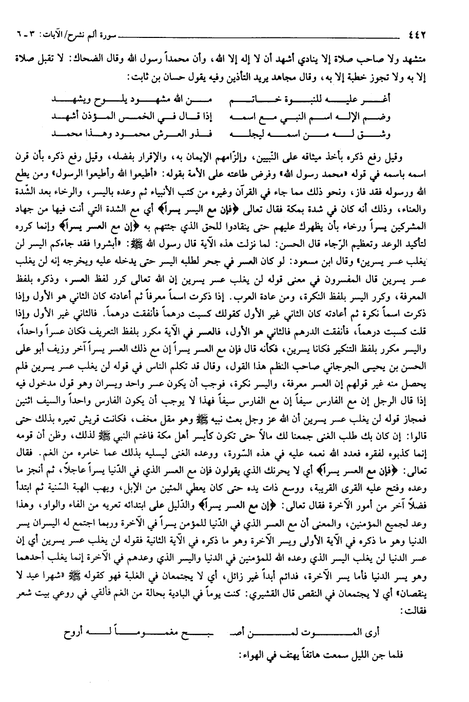 وقيل رفع ذكره بأخذ ميثاقه على النّبيين، وإلزامهم الإيمان به، والإقرار بفضله، وقيل رفع ذكره بأن قرن اسمه باسمه في قوله «محمد رسول الله» وفرض طاعته على الأمة بقوله: «أطيعوا الله وأطيعوا الرسول» ومن يطع الله ورسوله فقد فاز، ونحو ذلك مما جاء في القرآن وغيره من كتب الأنبياء ثم وعده باليسر، والرخاء بعد الشّدة والعناء، وذلك أنه كان في شدة بمكة فقال تعالى فَإِنَّ مَعَ الْعُسْرِ يُسْراً أي مع الشدة التي أنت فيها من جهاد المشركين يسرا ورخاء بأن يظهرك عليهم حتى ينقادوا للحق الذي جئتهم به إِنَّ مَعَ الْعُسْرِ يُسْراً وإنما كرره لتأكيد الوعد وتعظيم الرّجاء قال الحسن: لما نزلت هذه الآية قال رسول الله صلّى الله عليه وسلّم: «أبشروا فقد جاءكم اليسر لن يغلب عسر يسرين» وقال ابن مسعود: لو كان العسر في جحر لطلبه اليسر حتى يدخله عليه ويخرجه إنه لن يغلب عسر يسرين قال المفسرون في معنى قوله لن يغلب عسر يسرين إن الله تعالى كرر لفظ العسر، وذكره بلفظ المعرفة، وكرر اليسر بلفظ النكرة، ومن عادة العرب. إذا ذكرت اسما معرفا ثم أعادته كان الثاني هو الأول وإذا ذكرت اسما نكرة ثم أعادته كان الثاني غير الأول كقولك كسبت درهما فأنفقت درهما. فالثاني غير الأول وإذا قلت كسبت درهما، فأنفقت الدرهم فالثاني هو الأول، فالعسر في الآية مكرر بلفظ التعريف فكان عسرا واحدا، واليسر مكرر بلفظ التنكير فكانا يسرين، فكأنه قال فإن مع العسر يسرا إن مع ذلك العسر يسرا آخر وزيف أبو على الحسن بن يحيى الجرجاني صاحب النظم هذا القول، وقال قد تكلم الناس في قوله لن يغلب عسر يسرين فلم يحصل منه غير قولهم إن العسر معرفة، واليسر نكرة، فوجب أن يكون عسر واحد ويسران وهو قول مدخول فيه إذا قال الرجل إن مع الفارس سيفا إن مع الفارس سيفا فهذا لا يوجب أن يكون الفارس واحدا والسيف اثنين فمجاز قوله لن يغلب عسر يسرين أن الله عز وجل بعث نبيه صلّى الله عليه وسلّم وهو مقل مخف، فكانت قريش تعيره بذلك حتى قالوا: إن كان بك طلب الغنى جمعنا لك مالا حتى تكون كأيسر أهل مكة فاغتم النبي صلّى الله عليه وسلّم لذلك، وظن أن قومه إنما كذبوه لفقره فعدد الله نعمه عليه في هذه السّورة، ووعده الغنى ليسليه بذلك عما خامره من الغم. فقال تعالى: فَإِنَّ مَعَ الْعُسْرِ يُسْراً أي لا يحرنك الذي يقولون فإن مع العسر الذي في الدّنيا يسرا عاجلا، ثم أنجز ما وعده وفتح عليه القرى القريبة، ووسع ذات يده حتى كان يعطي المئين من الإبل، ويهب الهبة السّنية ثم ابتدأ فضلا آخر من أمور الآخرة فقال تعالى: إِنَّ مَعَ الْعُسْرِ يُسْراً والدّليل على ابتدائه تعريه من الفاء والواو، وهذا وعد لجميع المؤمنين، والمعنى أن مع العسر الذي في الدّنيا للمؤمن يسرا في الآخرة وربما اجتمع له اليسران يسر الدنيا وهو ما ذكره في الآية الأولى ويسر الآخرة وهو ما ذكره في الآية الثانية فقوله لن يغلب عسر يسرين أي إن عسر الدنيا لن يغلب اليسر الذي وعده الله للمؤمنين في الدنيا واليسر الذي وعدهم في الآخرة إنما يغلب أحدهما وهو يسر الدنيا فأما يسر الآخرة، فدائم أبدا غير زائل، أي لا يجتمعان في الغلبة فهو كقوله صلّى الله عليه وسلّم «شهرا عيد لا ينقصان» أي لا يجتمعان في النقص قال القشيري: كنت يوما في البادية بحالة من الغم فألقي في روعي بيت شعر فقالت: