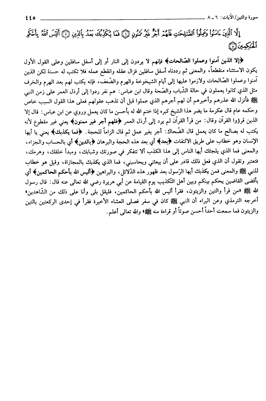 إِلاَّ الَّذِينَ آمَنُوا وَعَمِلُوا الصَّالِحاتِ فَلَهُمْ أَجْرٌ غَيْرُ مَمْنُونٍ (6) فَما يُكَذِّبُكَ بَعْدُ بِالدِّينِ (7) أَلَيْسَ اللَّهُ بِأَحْكَمِ الْحاكِمِينَ (8)