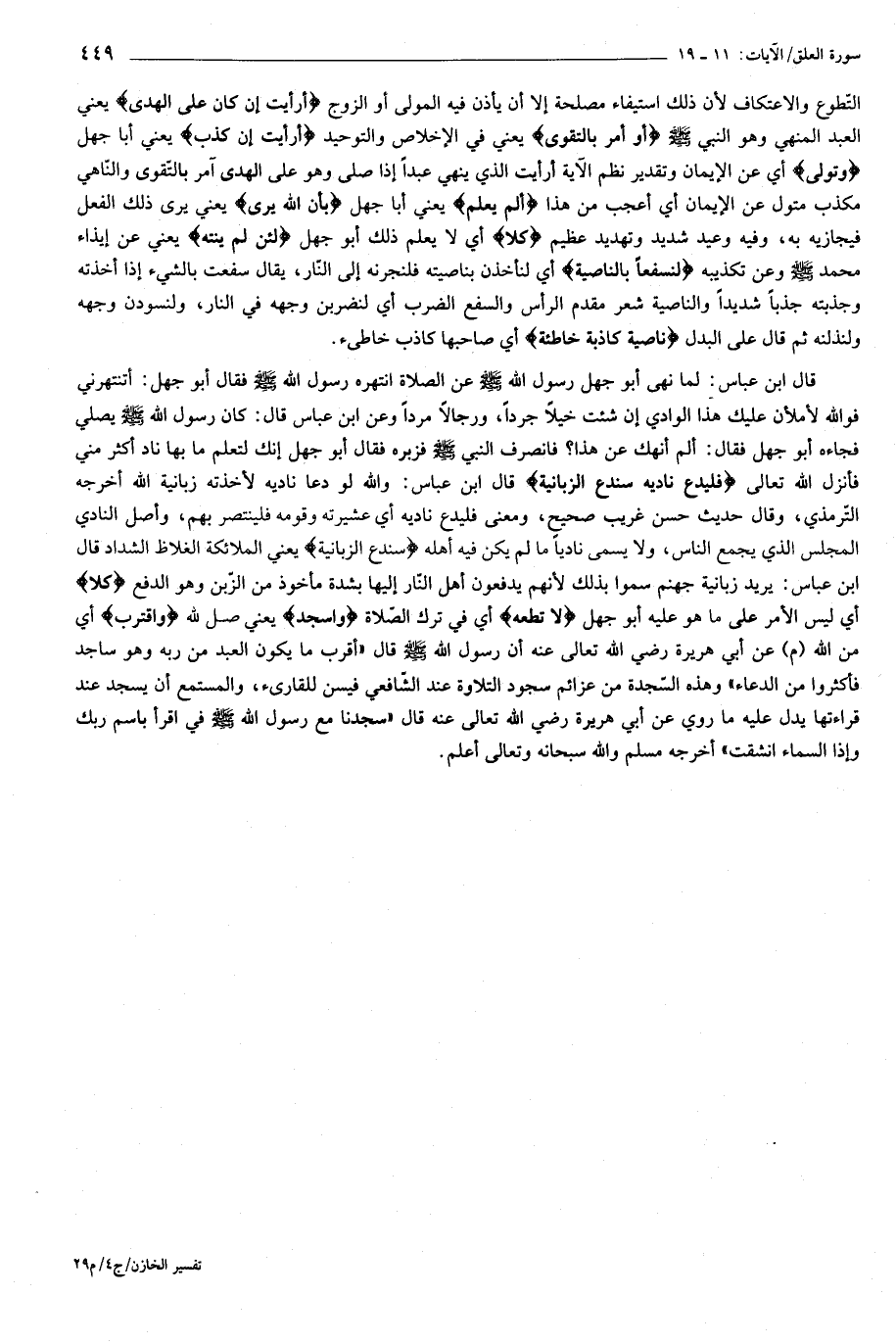 قال ابن عباس: لما نهى أبو جهل رسول الله صلّى الله عليه وسلّم عن الصلاة انتهره رسول الله صلّى الله عليه وسلّم فقال أبو جهل: أتنتهرني فو الله لأملأن عليك هذا الوادي إن شئت خيلا جردا، ورجالا مردا وعن ابن عباس قال: كان رسول الله صلّى الله عليه وسلّم يصلي فجاءه أبو جهل فقال: ألم أنهك عن هذا؟ فانصرف النبي صلّى الله عليه وسلّم فزبره فقال أبو جهل إنك لتعلم ما بها ناد أكثر مني فأنزل الله تعالى فَلْيَدْعُ نادِيَهُ سَنَدْعُ الزَّبانِيَةَ قال ابن عباس: والله لو دعا ناديه لأخذته زبانية الله أخرجه التّرمذي، وقال حديث حسن غريب صحيح، ومعنى فليدع ناديه أي عشيرته وقومه فلينتصر بهم، وأصل النادي المجلس الذي يجمع الناس، ولا يسمى ناديا ما لم يكن فيه أهله سَنَدْعُ الزَّبانِيَةَ يعني الملائكة الغلاظ الشداد قال ابن عباس: يريد زبانية جهنم سموا بذلك لأنهم يدفعون أهل النّار إليها بشدة مأخوذ من الزّبن وهو الدفع كَلَّا أي ليس الأمر على ما هو عليه أبو جهل لا تُطِعْهُ أي في ترك الصّلاة وَاسْجُدْ يعني صل لله وَاقْتَرِبْ أي من الله (م) عن أبي هريرة رضي الله تعالى عنه أن رسول الله صلّى الله عليه وسلّم قال «أقرب ما يكون العبد من ربه وهو ساجد فأكثروا من الدعاء» وهذه السّجدة من عزائم سجود التلاوة عند الشّافعي فيسن للقارئ، والمستمع أن يسجد عند قراءتها يدل عليه ما روي عن أبي هريرة رضي الله تعالى عنه قال «سجدنا مع رسول الله صلّى الله عليه وسلّم في اقرأ باسم ربك وإذا السماء انشقت» أخرجه مسلم والله سبحانه وتعالى أعلم.