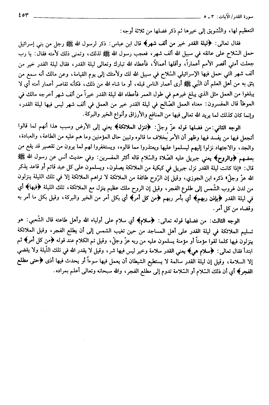 الوجه الثاني: من فضلها قوله عزّ وجلّ: تَنَزَّلُ الْمَلائِكَةُ يعني إلى الأرض وسبب هذا أنهم لما قالوا أتجعل فيها من يفسد فيها وظهر أن الأمر بخلاف ما قالوه وتبين حال المؤمنين وما هم عليه من الطاعة، والعبادة، والجد، والاجتهاد نزلوا إليهم ليسلموا عليها ويعتذروا مما قالوه، ويستغفروا لهم لما يرون من تقصير قد يقع من بعضهم وَالرُّوحُ يعني جبريل عليه الصّلاة والسّلام قاله أكثر المفسرين: وفي حديث أنس عن رسول الله صلّى الله عليه وسلّم قال: «إذا كانت ليلة القدر نزل جبريل في كبكبة من الملائكة يصلون، ويسلمون على كل عبد قائم أو قاعد يذكر الله عزّ وجلّ» ذكره ابن الجوزي، وقيل إن الرّوح طائفة من الملائكة لا تراهم الملائكة إلا في تلك الليلة ينزلون من لدن غروب الشّمس إلى طلوع الفجر، وقيل إن الروح ملك عظيم ينزل مع الملائكة، تلك الليلة فِيها أي في ليلة القدر بِإِذْنِ رَبِّهِمْ أي بأمر ربهم مِنْ كُلِّ أَمْرٍ أي بكل أمر من الخير والبركة، وقيل بكل ما أمر به وقضاه من كل أمر.