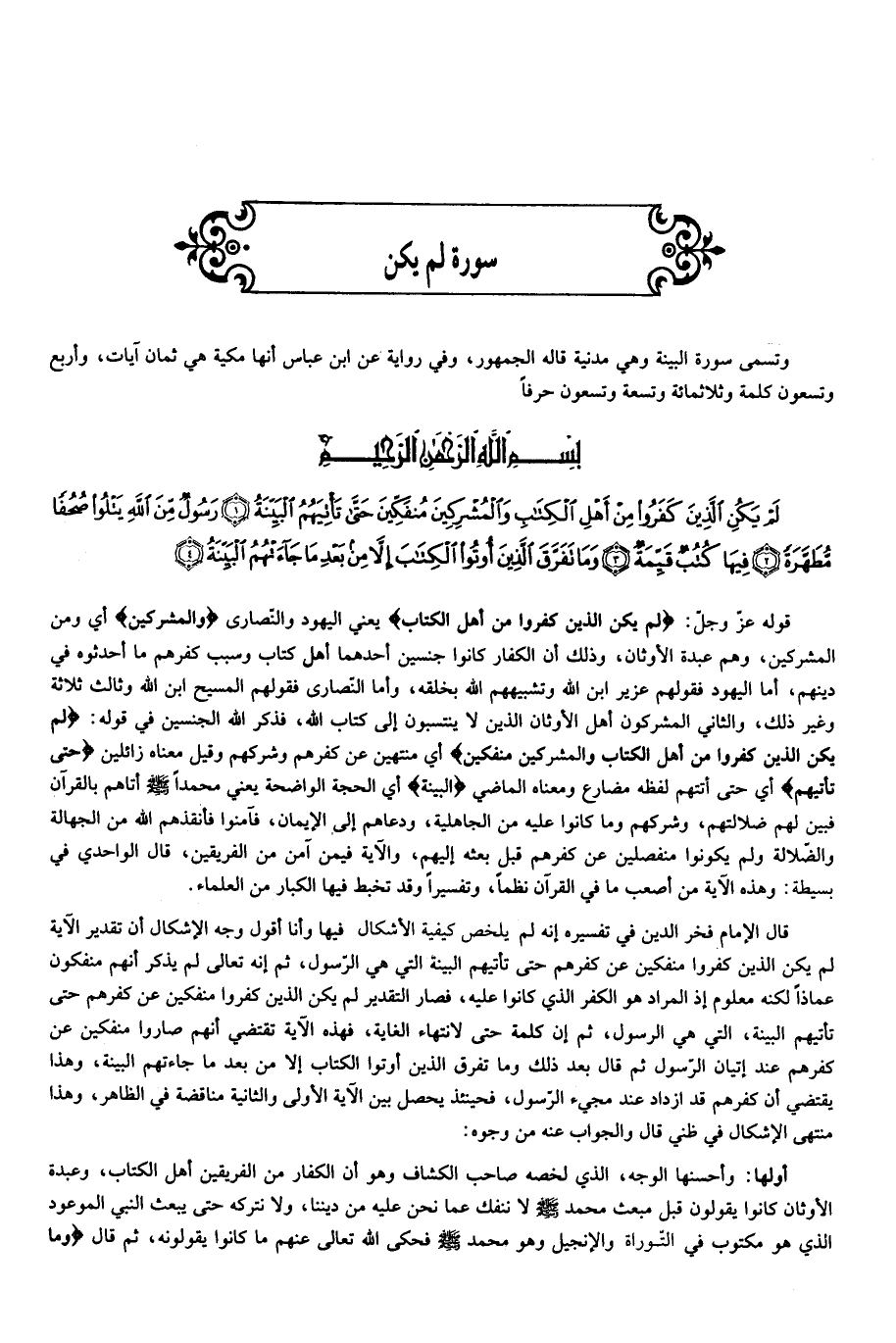 وتسمى سورة البينة وهي مدنية قاله الجمهور، وفي رواية عن ابن عباس أنها مكية هي ثمان آيات، وأربع وتسعون كلمة وثلاثمائة وتسعة وتسعون حرفا بسم الله الرّحمن الرّحيم