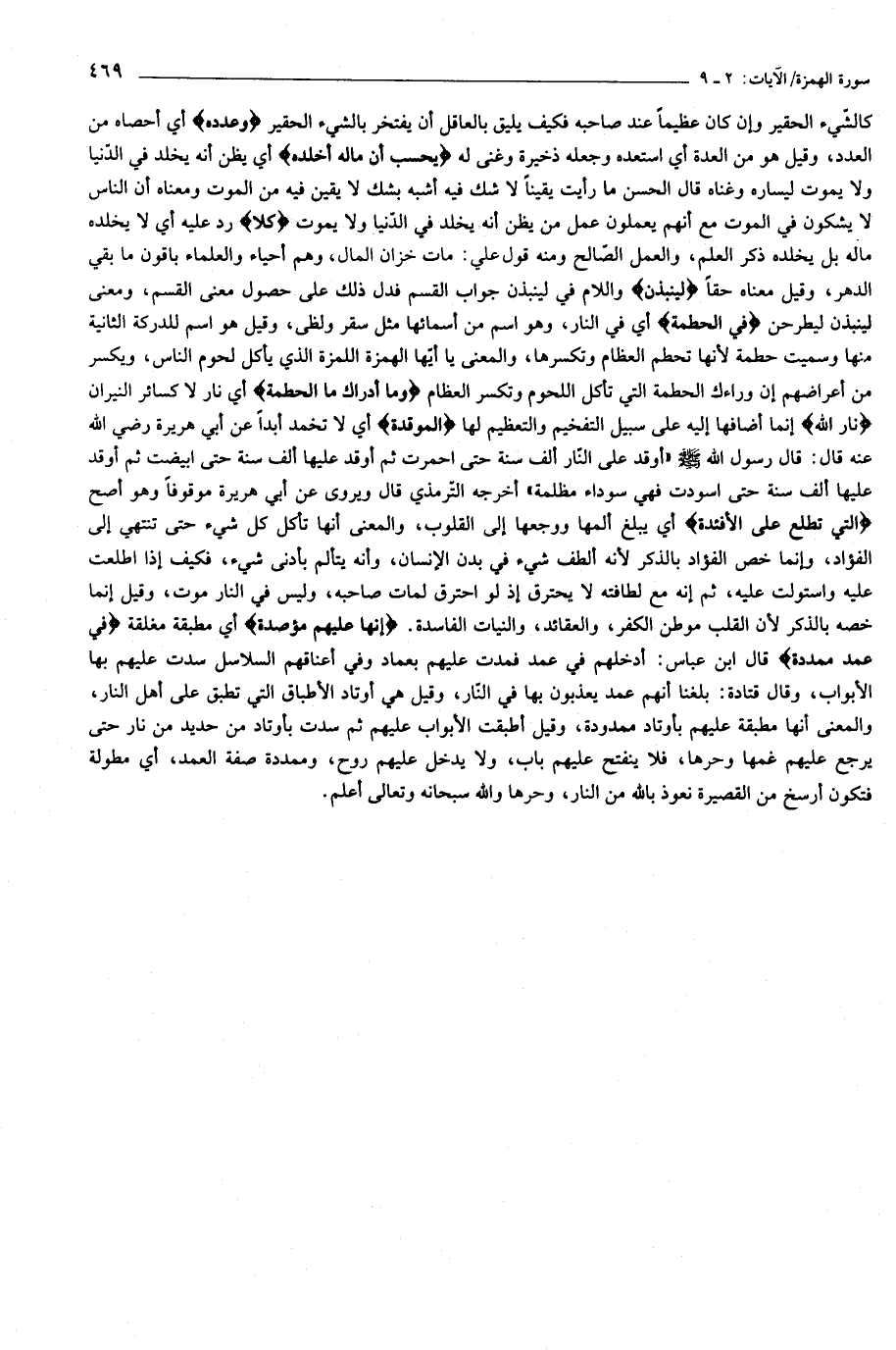 كالشّيء الحقير وإن كان عظيما عند صاحبه فكيف يليق بالعاقل أن يفتخر بالشيء الحقير وَعَدَّدَهُ أي أحصاه من العدد، وقيل هو من العدة أي استعده وجعله ذخيرة وغنى له يَحْسَبُ أَنَّ مالَهُ أَخْلَدَهُ أي يظن أنه يخلد في الدّنيا ولا يموت ليساره وغناه قال الحسن ما رأيت يقينا لا شك فيه أشبه بشك لا يقين فيه من الموت ومعناه أن الناس لا يشكون في الموت مع أنهم يعملون عمل من يظن أنه يخلد في الدّنيا ولا يموت كَلَّا رد عليه أي لا يخلده ماله بل يخلده ذكر العلم، والعمل الصّالح ومنه قول علي: مات خزان المال، وهم أحياء والعلماء باقون ما بقي الدهر، وقيل معناه حقا لَيُنْبَذَنَّ واللام في لينبذن جواب القسم فدل ذلك على حصول معنى القسم، ومعنى لينبذن ليطرحن فِي الْحُطَمَةِ أي في النار، وهو اسم من أسمائها مثل سقر ولظى، وقيل هو اسم للدركة الثانية منها وسميت حطمة لأنها تحطم العظام وتكسرها، والمعنى يا أيّها الهمزة اللمزة الذي يأكل لحوم الناس، ويكسر من أعراضهم إن وراءك الحطمة التي تأكل اللحوم وتكسر العظام وَما أَدْراكَ مَا الْحُطَمَةُ أي نار لا كسائر النيران نارُ اللَّهِ إنما أضافها إليه على سبيل التفخيم والتعظيم لها الْمُوقَدَةُ أي لا تخمد أبدا عن أبي هريرة رضي الله عنه قال: قال رسول الله صلّى الله عليه وسلّم «أوقد على النّار ألف سنة حتى احمرت ثم أوقد عليها ألف سنة حتى ابيضت ثم أوقد عليها ألف سنة حتى اسودت فهي سوداء مظلمة» أخرجه التّرمذي قال ويروى عن أبي هريرة موقوفا وهو أصح الَّتِي تَطَّلِعُ عَلَى الْأَفْئِدَةِ أي يبلغ ألمها ووجعها إلى القلوب، والمعنى أنها تأكل كل شيء حتى تنتهي إلى الفؤاد، وإنما خص الفؤاد بالذكر لأنه ألطف شيء في بدن الإنسان، وأنه يتألم بأدنى شيء، فكيف إذا اطلعت عليه واستولت عليه، ثم إنه مع لطافته لا يحترق إذ لو احترق لمات صاحبه، وليس في النار موت، وقيل إنما خصه بالذكر لأن القلب موطن الكفر، والعقائد، والنيات الفاسدة. إِنَّها عَلَيْهِمْ مُؤْصَدَةٌ أي مطبقة مغلقة فِي عَمَدٍ مُمَدَّدَةٍ قال ابن عباس: أدخلهم في عمد فمدت عليهم بعماد وفي أعناقهم السلاسل سدت عليهم بها الأبواب، وقال قتادة: بلغنا أنهم عمد يعذبون بها في النّار، وقيل هي أوتاد الأطباق التي تطبق على أهل النار، والمعنى أنها مطبقة عليهم بأوتاد ممدودة، وقيل أطبقت الأبواب عليهم ثم سدت بأوتاد من حديد من نار حتى يرجع عليهم غمها وحرها، فلا ينفتح عليهم باب، ولا يدخل عليهم روح، وممددة صفة العمد، أي مطولة فتكون أرسخ من القصيرة نعوذ بالله من النار، وحرها والله سبحانه وتعالى أعلم.