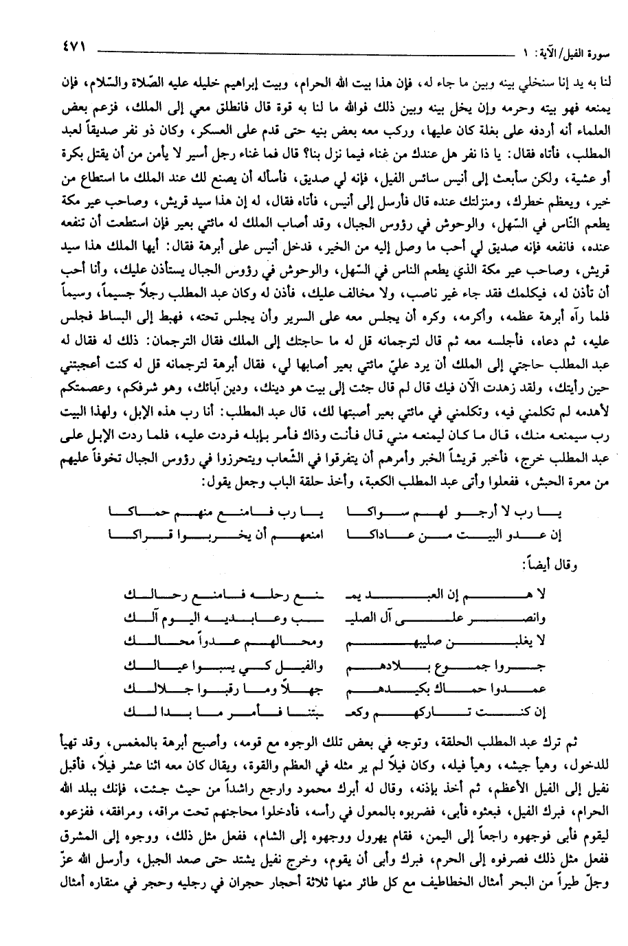 ، وكره أن يجلس معه على السرير وأن يجلس تحته، فهبط إلى البساط فجلس عليه، ثم دعاه، فأجلسه معه ثم قال لترجمانه قل له ما حاجتك إلى الملك فقال الترجمان: ذلك له فقال له عبد المطلب حاجتي إلى الملك أن يرد عليّ مائتي بعير أصابها لي، فقال أبرهة لترجمانه قل له كنت أعجبتني حين رأيتك، ولقد زهدت الآن فيك قال لم قال جئت إلى بيت هو دينك، ودين آبائك، وهو شرفكم، وعصمتكم لأهدمه لم تكلمني فيه، وتكلمني في مائتي بعير أصبتها لك، قال عبد المطلب: أنا رب هذه الإبل، ولهذا البيت رب سيمنعه منك، قال ما كان ليمنعه مني قال فأنت وذاك فأمر بإبله فردت عليه، فلما ردت الإبل على عبد المطلب خرج، فأخبر قريشا الخبر وأمرهم أن يتفرقوا في الشّعاب ويتحرزوا في رؤوس الجبال تخوفا عليهم من معرة الحبش، ففعلوا وأتى عبد المطلب الكعبة، وأخذ حلقة الباب وجعل يقول: