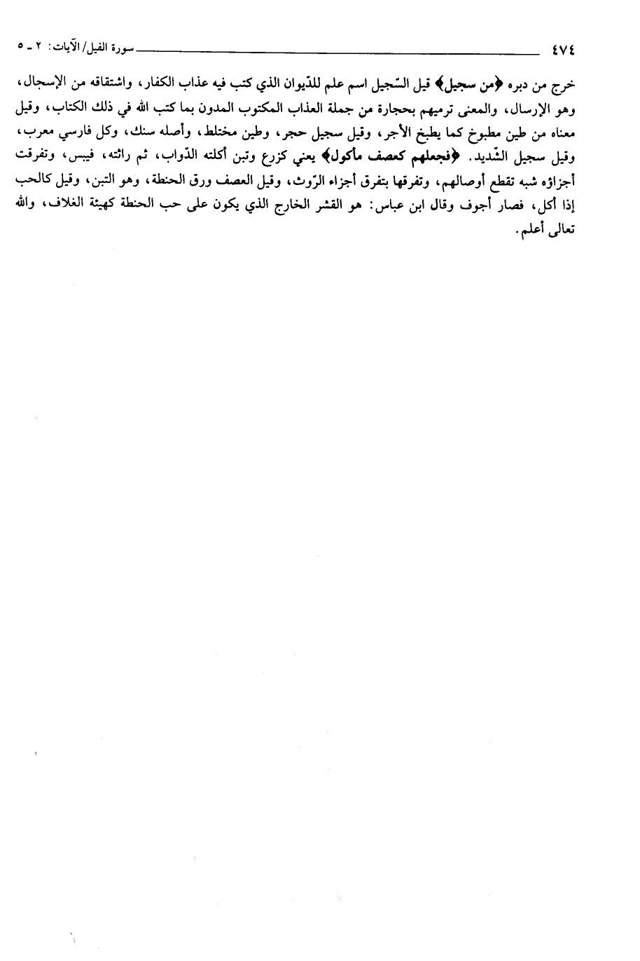 خرج من دبره مِنْ سِجِّيلٍ قيل السّجيل اسم علم للدّيوان الذي كتب فيه عذاب الكفار، واشتقاقه من الإسجال، وهو الإرسال، والمعنى ترميهم بحجارة من جملة العذاب المكتوب المدون بما كتب الله في ذلك الكتاب، وقيل معناه من طين مطبوخ كما يطبخ الأجر، وقيل سجيل حجر، وطين مختلط، وأصله سنك، وكل فارسي معرب، وقيل سجيل الشّديد. فَجَعَلَهُمْ كَعَصْفٍ مَأْكُولٍ يعني كزرع وتبن أكلته الدّواب، ثم راثته، فيبس، وتفرقت أجزاؤه شبه تقطع أوصالهم، وتفرقها بتفرق أجزاء الرّوث، وقيل العصف ورق الحنطة، وهو التبن، وقيل كالحب إذا أكل، فصار أجوف وقال ابن عباس: هو القشر الخارج الذي يكون على حب الحنطة كهيئة الغلاف، والله تعالى أعلم.