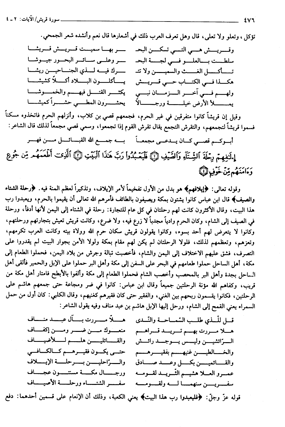 إِيلافِهِمْ رِحْلَةَ الشِّتاءِ وَالصَّيْفِ (2) فَلْيَعْبُدُوا رَبَّ هذَا الْبَيْتِ (3) الَّذِي أَطْعَمَهُمْ مِنْ جُوعٍ وَآمَنَهُمْ مِنْ خَوْفٍ (4)