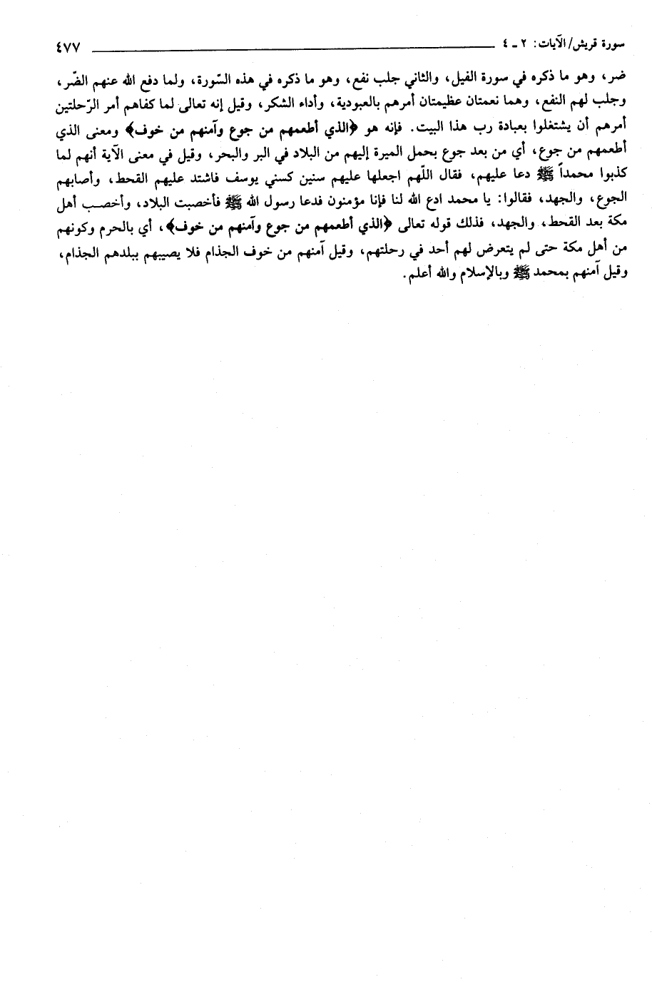 ضر، وهو ما ذكره في سورة الفيل، والثاني جلب نفع، وهو ما ذكره في هذه السّورة، ولما دفع الله عنهم الضّر، وجلب لهم النفع، وهما نعمتان عظيمتان أمرهم بالعبودية، وأداء الشكر، وقيل إنه تعالى لما كفاهم أمر الرّحلتين أمرهم أن يشتغلوا بعبادة رب هذا البيت. فإنه هو الَّذِي أَطْعَمَهُمْ مِنْ جُوعٍ وَآمَنَهُمْ مِنْ خَوْفٍ ومعنى الذي أطعمهم من جوع، أي من بعد جوع بحمل الميرة إليهم من البلاد في البر والبحر، وقيل في معنى الآية أنهم لما كذبوا محمدا صلّى الله عليه وسلّم دعا عليهم، فقال اللهم اجعلها عليهم سنين كسني يوسف فاشتد عليهم القحط، وأصابهم الجوع، والجهد، فقالوا: يا محمد ادع الله لنا فإنا مؤمنون فدعا رسول الله صلّى الله عليه وسلّم فأخصبت البلاد، وأخصب أهل مكة بعد القحط، والجهد، فذلك قوله تعالى الَّذِي أَطْعَمَهُمْ مِنْ جُوعٍ وَآمَنَهُمْ مِنْ خَوْفٍ، أي بالحرم وكونهم من أهل مكة حتى لم يتعرض لهم أحد في رحلتهم، وقيل آمنهم من خوف الجذام فلا يصيبهم ببلدهم الجذام، وقيل آمنهم بمحمد صلّى الله عليه وسلّم وبالإسلام والله أعلم.