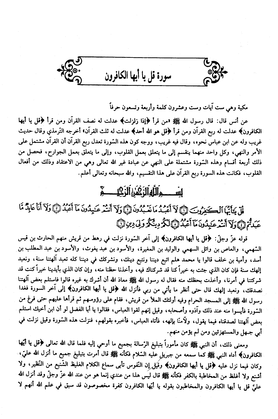 قُلْ يا أَيُّهَا الْكافِرُونَ (1) لا أَعْبُدُ ما تَعْبُدُونَ (2) وَلا أَنْتُمْ عابِدُونَ ما أَعْبُدُ (3) وَلا أَنا عابِدٌ ما عَبَدْتُّمْ (4)