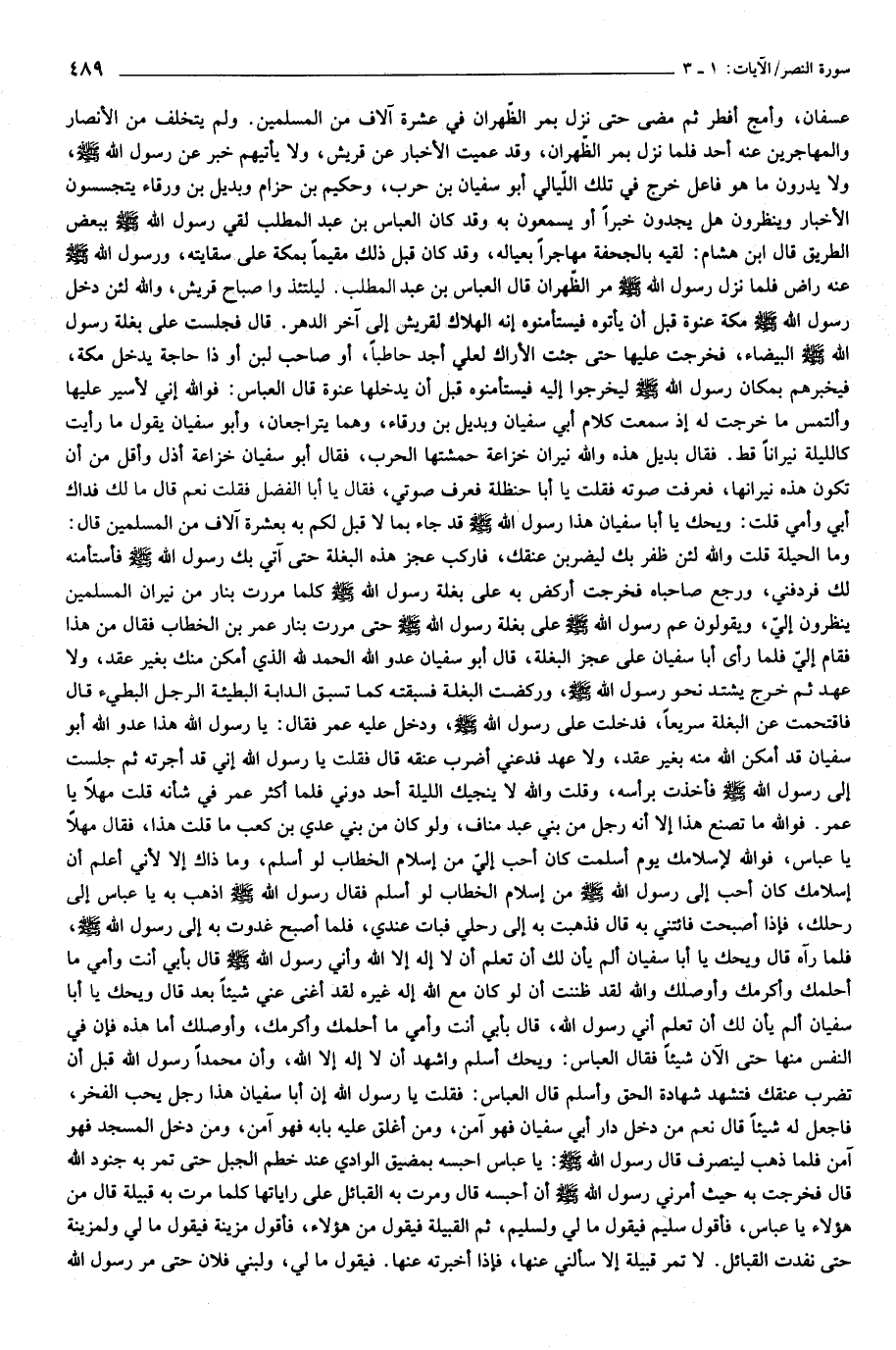 وما الحيلة قلت والله لئن ظفر بك ليضربن عنقك، فاركب عجز هذه البغلة حتى آتي بك رسول الله صلّى الله عليه وسلّم فأستأمنه لك فردفني، ورجع صاحباه فخرجت أركض به على بغلة رسول الله صلّى الله عليه وسلّم كلما مررت بنار من نيران المسلمين ينظرون إليّ، ويقولون عم رسول الله صلّى الله عليه وسلّم على بغلة رسول الله صلّى الله عليه وسلّم حتى مررت بنار عمر بن الخطاب فقال من هذا فقام إليّ فلما رأى أبا سفيان على عجز البغلة، قال أبو سفيان عدو الله الحمد لله الذي أمكن منك بغير عقد، ولا عهد ثم خرج يشتد نحو رسول الله صلّى الله عليه وسلّم، وركضت البغلة فسبقته كما تسبق الدابة البطيئة الرجل البطيء قال فاقتحمت عن البغلة سريعا، فدخلت على رسول الله صلّى الله عليه وسلّم، ودخل عليه عمر فقال: يا رسول الله هذا عدو الله أبو سفيان قد أمكن الله منه بغير عقد، ولا عهد فدعني أضرب عنقه قال فقلت يا رسول الله إني قد أجرته ثم جلست إلى رسول الله صلّى الله عليه وسلّم فأخذت برأسه، وقلت والله لا ينجيك الليلة أحد دوني فلما أكثر عمر في شأنه قلت مهلا يا عمر. فو الله ما تصنع هذا إلا أنه رجل من بني عبد مناف، ولو كان من بني عدي بن كعب ما قلت هذا، فقال مهلا يا عباس، فو الله لإسلامك يوم أسلمت كان أحب إليّ من إسلام الخطاب لو أسلم، وما ذاك إلا لأني أعلم أن إسلامك كان أحب إلى رسول الله صلّى الله عليه وسلّم من إسلام الخطاب لو أسلم فقال رسول الله صلّى الله عليه وسلّم اذهب به يا عباس إلى رحلك، فإذا أصبحت فائتني به قال فذهبت به إلى رحلي فبات عندي، فلما أصبح غدوت به إلى رسول الله صلّى الله عليه وسلّم، فلما رآه قال ويحك يا أبا سفيان ألم يأن لك أن تعلم أن لا إله إلا الله وأني رسول الله صلّى الله عليه وسلّم قال بأبي أنت وأمي ما أحلمك وأكرمك وأوصلك والله لقد ظننت أن لو كان مع الله إله غيره لقد أغنى عني شيئا بعد قال ويحك يا أبا سفيان ألم يأن لك أن تعلم أني رسول الله، قال بأبي أنت وأمي ما أحلمك وأكرمك، وأوصلك أما هذه فإن في النفس منها حتى الآن شيئا فقال العباس: ويحك أسلم واشهد أن لا إله إلا الله، وأن محمدا رسول الله قبل أن تضرب عنقك فتشهد شهادة الحق وأسلم قال العباس: فقلت يا رسول الله إن أبا سفيان هذا رجل يحب الفخر، فاجعل له شيئا قال نعم من دخل دار أبي سفيان فهو آمن، ومن أغلق عليه بابه فهو آمن، ومن دخل المسجد فهو آمن فلما ذهب لينصرف قال رسول الله صلّى الله عليه وسلّم: يا عباس احبسه بمضيق الوادي عند خطم الجبل حتى تمر به جنود الله قال فخرجت به حيث أمرني رسول الله صلّى الله عليه وسلّم أن أحبسه قال ومرت به القبائل على راياتها كلما مرت به قبيلة قال من هؤلاء يا عباس، فأقول سليم فيقول ما لي ولسليم، ثم القبيلة فيقول من هؤلاء، فأقول مزينة فيقول ما لي ولمزينة حتى نفدت القبائل. لا تمر قبيلة إلا سألني عنها، فإذا أخبرته عنها. فيقول ما لي، ولبني فلان حتى مر رسول الله