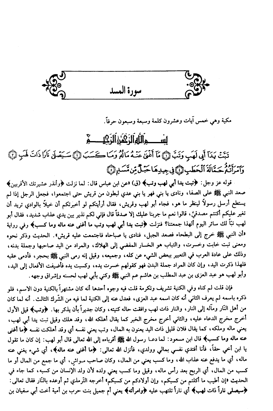 تَبَّتْ يَدا أَبِي لَهَبٍ وَتَبَّ (1) ما أَغْنى عَنْهُ مالُهُ وَما كَسَبَ (2) سَيَصْلى ناراً ذاتَ لَهَبٍ (3) وَامْرَأَتُهُ حَمَّالَةَ الْحَطَبِ (4)
