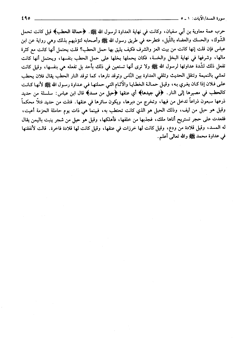 حرب عمة معاوية بن أبي سفيان، وكانت في نهاية العداوة لرسول الله صلّى الله عليه وسلّم. حَمَّالَةَ الْحَطَبِ قيل كانت تحمل الشّوك، والحسك والعضاه باللّيل، فتطرحه في طريق رسول الله صلّى الله عليه وسلّم وأصحابه لتؤذيهم بذلك وهي رواية عن ابن عباس فإن قلت إنها كانت من بيت العز والشرف فكيف يليق بها حمل الحطب؟ قلت يحتمل أنها كانت مع كثرة مالها، وشرفها في نهاية البخل والخسة، فكان يحملها بخلها على حمل الحطب بنفسها، ويحتمل أنها كانت تفعل ذلك لشدّة عداوتها لرسول الله صلّى الله عليه وسلّم ولا ترى أنها تستعين في ذلك بأحد بل تفعله هي بنفسها، وقيل كانت تمشي بالنميمة وتنقل الحديث وتلقي العداوة بين النّاس وتوقد نارها، كما توقد النار الحطب يقال فلان يحطب على فلان إذا كان يغري به، وقيل حمالة الخطايا والآثام التي حملتها في عداوة رسول الله صلّى الله عليه وسلّم لأنها كانت كالحطب في مصيرها إلى النار. فِي جِيدِها أي عنقها حَبْلٌ مِنْ مَسَدٍ قال ابن عباس: سلسلة من حديد ذرعها سبعون ذراعا تدخل من فيها، وتخرج من دبرها، ويكون سائرها في عنقها. فتلت من حديد فتلا محكما وقيل هو حبل من ليف، وذلك الحبل هو الذي كانت تحتطب به، فبينما هي ذات يوم حاملة الحزمة أعيت، فقعدت على حجر تستريح أتاها ملك، فجذبها من خلفها، فأهلكها، وقيل هو حبل من شجر ينبت باليمن يقال له المسد، وقيل قلادة من ودع، وقيل كانت لها خرزات في عنقها، وقيل كانت لها قلادة فاخرة. قالت لأنفقنها في عداوة محمد صلّى الله عليه وسلّم والله تعالى أعلم.