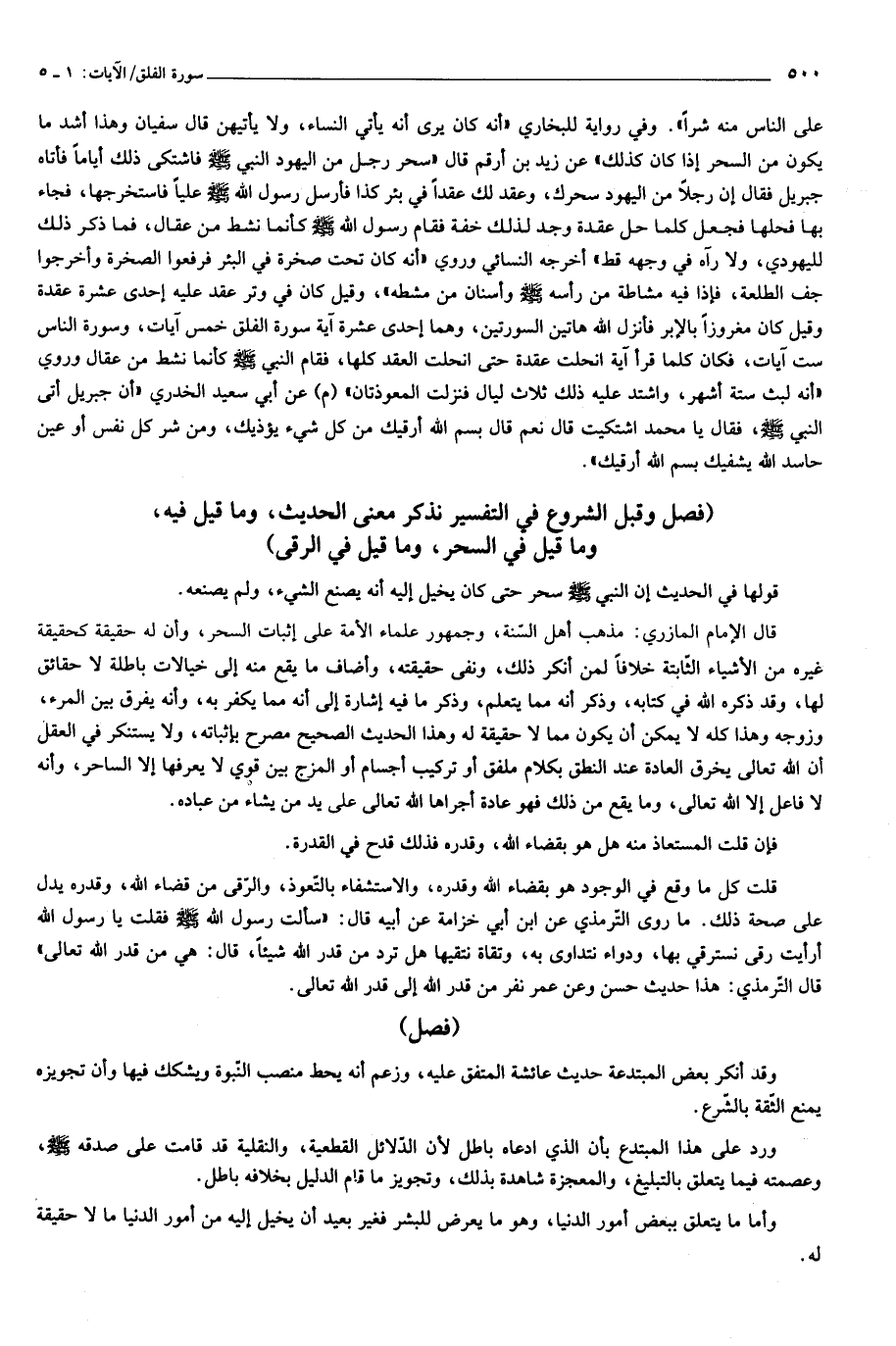 (فصل وقبل الشروع في التفسير نذكر معنى الحديث، وما قيل فيه، وما قيل في السحر، وما قيل في الرقى) قولها في الحديث إن النبي صلّى الله عليه وسلّم سحر حتى كان يخيل إليه أنه يصنع الشيء، ولم يصنعه.