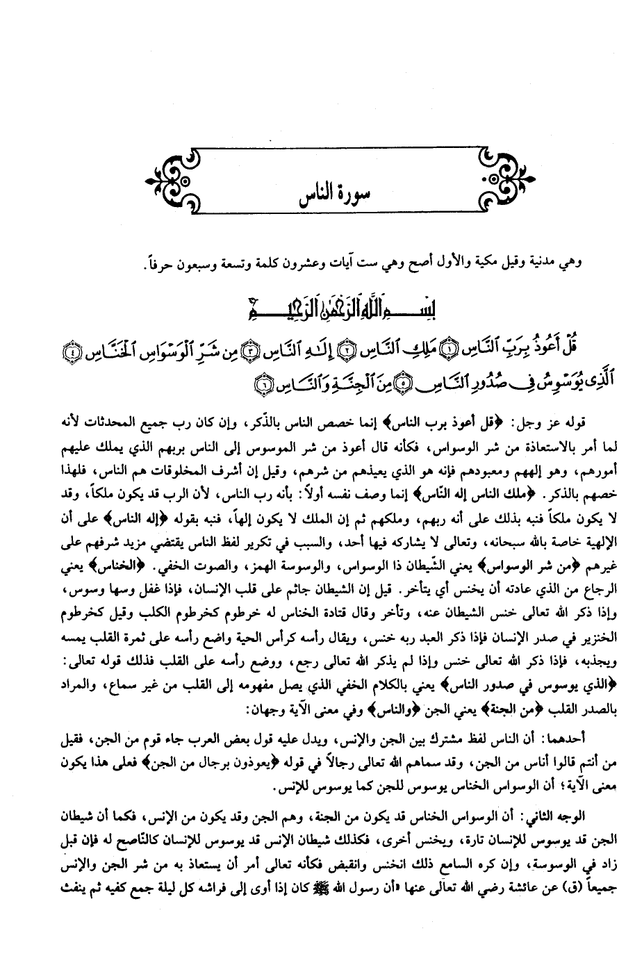 قوله عز وجل: قُلْ أَعُوذُ بِرَبِّ النَّاسِ إنما خصص الناس بالذّكر، وإن كان رب جميع المحدثات لأنه لما أمر بالاستعاذة من شر الوسواس، فكأنه قال أعوذ من شر الموسوس إلى الناس بربهم الذي يملك عليهم أمورهم، وهو إلههم ومعبودهم فإنه هو الذي يعيذهم من شرهم، وقيل إن أشرف المخلوقات هم الناس، فلهذا خصهم بالذكر. مَلِكِ النَّاسِ إِلهِ النَّاسِ إنما وصف نفسه أولا: بأنه رب الناس، لأن الرب قد يكون ملكا، وقد لا يكون ملكا فنبه بذلك على أنه ربهم، وملكهم ثم إن الملك لا يكون إلها، فنبه بقوله إِلهِ النَّاسِ على أن الإلهية خاصة بالله سبحانه، وتعالى لا يشاركه فيها أحد، والسبب في تكرير لفظ الناس يقتضي مزيد شرفهم على غيرهم مِنْ شَرِّ الْوَسْواسِ يعني الشّيطان ذا الوسواس، والوسوسة الهمز، والصوت الخفي. الْخَنَّاسِ يعني الرجاع من الذي عادته أن يخنس أي يتأخر. قيل إن الشيطان جاثم على قلب الإنسان، فإذا غفل وسها وسوس، وإذا ذكر الله تعالى خنس الشيطان عنه، وتأخر وقال قتادة الخناس له خرطوم كخرطوم الكلب وقيل كخرطوم الخنزير في صدر الإنسان فإذا ذكر العبد ربه خنس، ويقال رأسه كرأس الحية واضع رأسه على ثمرة القلب يمسه ويجذبه، فإذا ذكر الله تعالى خنس وإذا لم يذكر الله تعالى رجع، ووضع رأسه على القلب فذلك قوله تعالى: