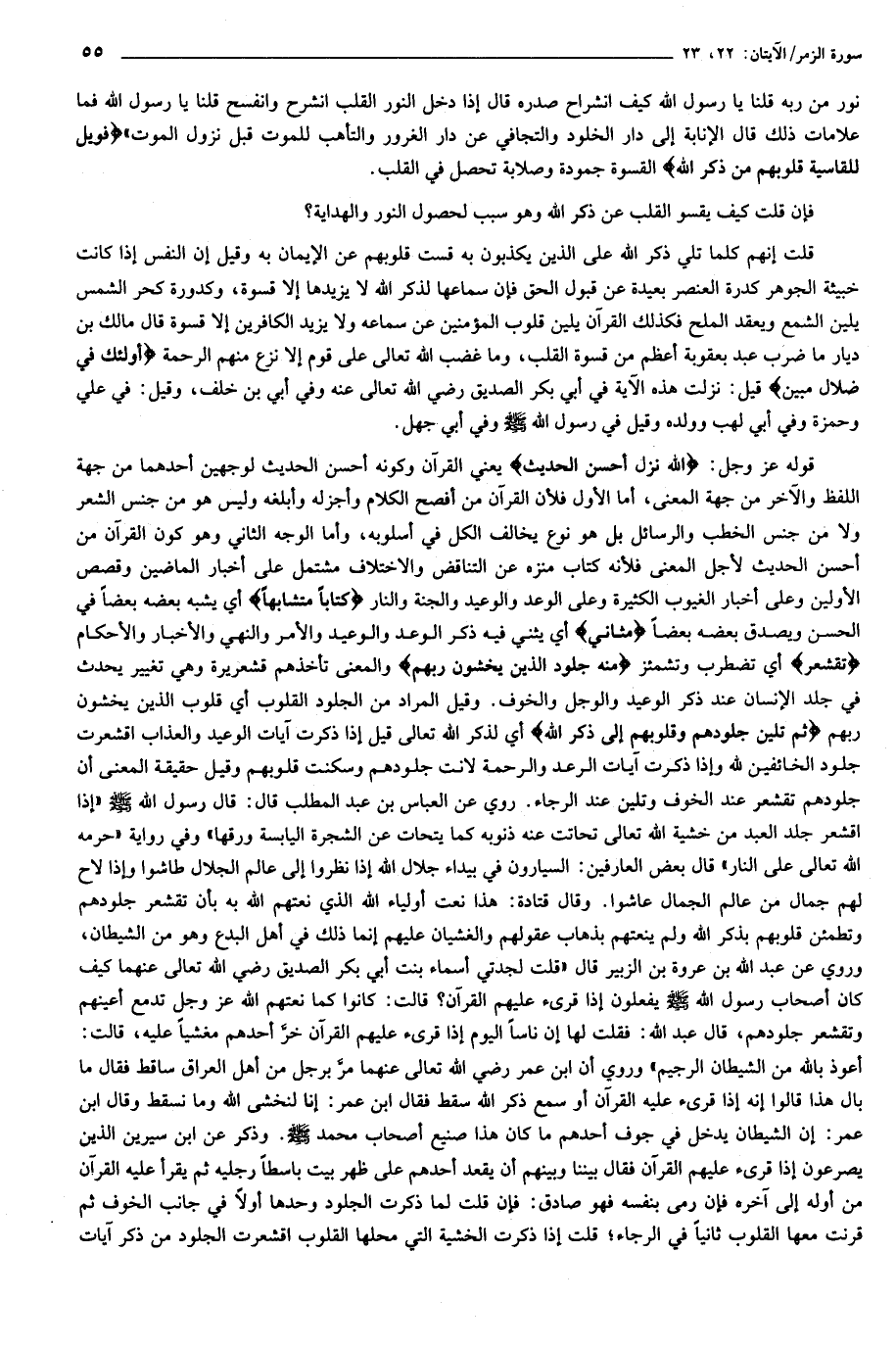 قوله عز وجل: اللَّهُ نَزَّلَ أَحْسَنَ الْحَدِيثِ يعني القرآن وكونه أحسن الحديث لوجهين أحدهما من جهة اللفظ والآخر من جهة المعنى، أما الأول فلأن القرآن من أفصح الكلام وأجزله وأبلغه وليس هو من جنس الشعر ولا من جنس الخطب والرسائل بل هو نوع يخالف الكل في أسلوبه، وأما الوجه الثاني وهو كون القرآن من أحسن الحديث لأجل المعنى فلأنه كتاب منزه عن التناقض والاختلاف مشتمل على أخبار الماضين وقصص الأولين وعلى أخبار الغيوب الكثيرة وعلى الوعد والوعيد والجنة والنار كِتاباً مُتَشابِهاً أي يشبه بعضه بعضا في الحسن ويصدق بعضه بعضا مَثانِيَ أي يثني فيه ذكر الوعد والوعيد والأمر والنهي والأخبار والأحكام تَقْشَعِرُّ أي تضطرب وتشمئز مِنْهُ جُلُودُ الَّذِينَ يَخْشَوْنَ رَبَّهُمْ والمعنى تأخذهم قشعريرة وهي تغيير يحدث في جلد الإنسان عند ذكر الوعيد والوجل والخوف. وقيل المراد من الجلود القلوب أي قلوب الذين يخشون ربهم ثُمَّ تَلِينُ جُلُودُهُمْ وَقُلُوبُهُمْ إِلى ذِكْرِ اللَّهِ أي لذكر الله تعالى قيل إذا ذكرت آيات الوعيد والعذاب اقشعرت جلود الخائفين لله وإذا ذكرت آيات الرعد والرحمة لانت جلودهم وسكنت قلوبهم وقيل حقيقة المعنى أن جلودهم تقشعر عند الخوف وتلين عند الرجاء. روي عن العباس بن عبد المطلب قال: قال رسول الله صلّى الله عليه وسلّم «إذا اقشعر جلد العبد من خشية الله تعالى تحاتت عنه ذنوبه كما يتحات عن الشجرة اليابسة ورقها» وفي رواية «حرمه الله تعالى على النار» قال بعض العارفين: السيارون في بيداء جلال الله إذا نظروا إلى عالم الجلال طاشوا وإذا لاح لهم جمال من عالم الجمال عاشوا. وقال قتادة: هذا نعت أولياء الله الذي نعتهم الله به بأن تقشعر جلودهم وتطمئن قلوبهم بذكر الله ولم ينعتهم بذهاب عقولهم والغشيان عليهم إنما ذلك في أهل البدع وهو من الشيطان، وروي عن عبد الله بن عروة بن الزبير قال «قلت لجدتي أسماء بنت أبي بكر الصديق رضي الله تعالى عنهما كيف كان أصحاب رسول الله صلّى الله عليه وسلّم يفعلون إذا قرئ عليهم القرآن؟ قالت: كانوا كما نعتهم الله عز وجل تدمع أعينهم وتقشعر جلودهم، قال عبد الله: فقلت لها إن ناسا اليوم إذا قرئ عليهم القرآن خرّ أحدهم مغشيا عليه، قالت: