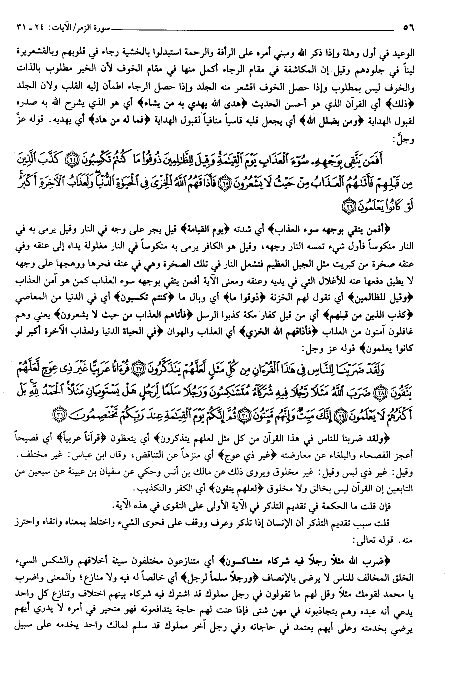 وَلَقَدْ ضَرَبْنا لِلنَّاسِ فِي هذَا الْقُرْآنِ مِنْ كُلِّ مَثَلٍ لَعَلَّهُمْ يَتَذَكَّرُونَ (27) قُرْآناً عَرَبِيًّا غَيْرَ ذِي عِوَجٍ لَعَلَّهُمْ يَتَّقُونَ (28) ضَرَبَ اللَّهُ مَثَلاً رَجُلاً فِيهِ شُرَكاءُ مُتَشاكِسُونَ وَرَجُلاً سَلَماً لِرَجُلٍ هَلْ يَسْتَوِيانِ مَثَلاً الْحَمْدُ لِلَّهِ بَلْ أَكْثَرُهُمْ لا يَعْلَمُونَ (29) إِنَّكَ مَيِّتٌ وَإِنَّهُمْ مَيِّتُونَ (30) ثُمَّ إِنَّكُمْ يَوْمَ الْقِيامَةِ عِنْدَ رَبِّكُمْ تَخْتَصِمُونَ (31)