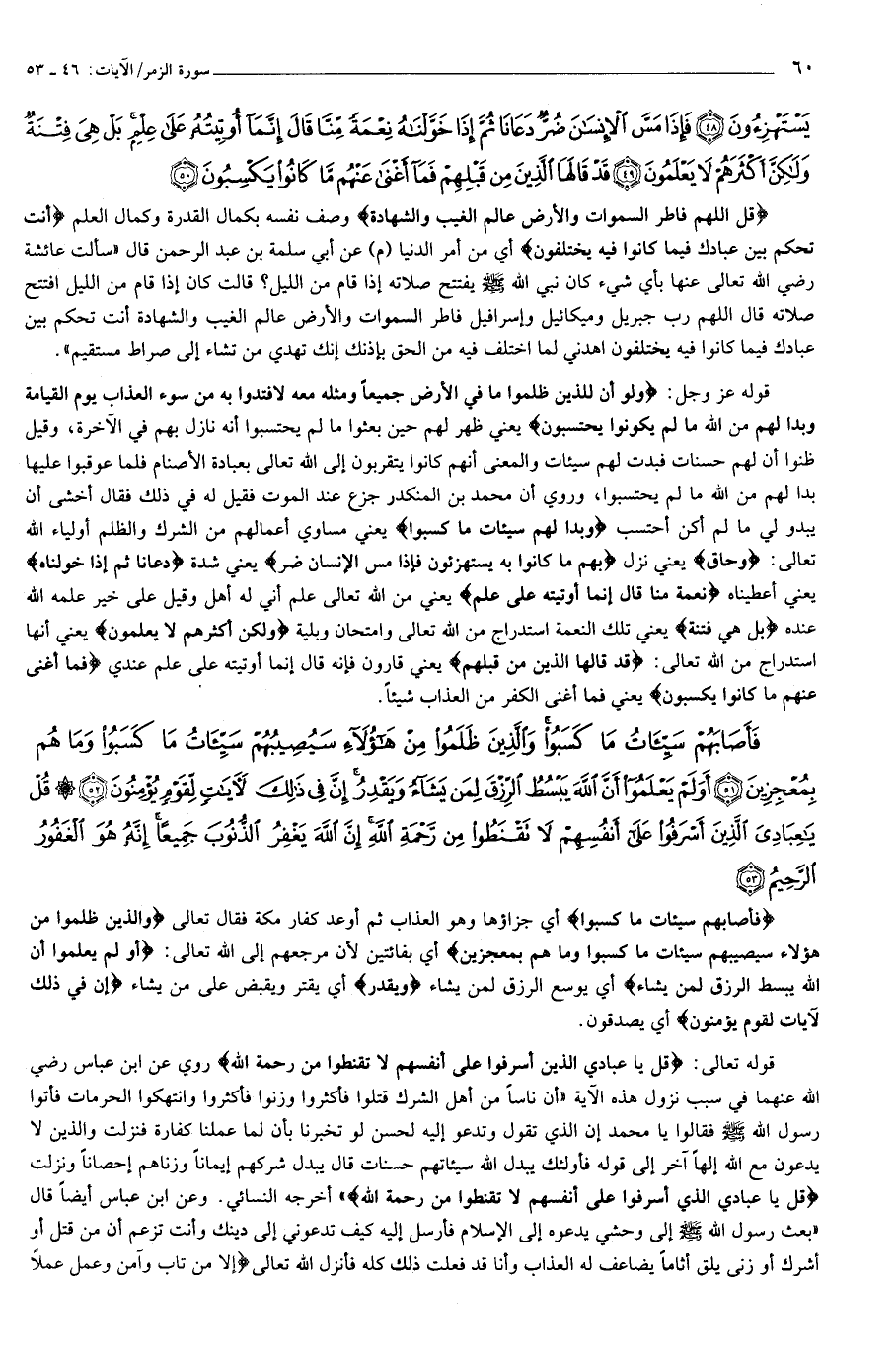 قُلِ اللَّهُمَّ فاطِرَ السَّماواتِ وَالْأَرْضِ عالِمَ الْغَيْبِ وَالشَّهادَةِ أَنْتَ تَحْكُمُ بَيْنَ عِبادِكَ فِي ما كانُوا فِيهِ يَخْتَلِفُونَ (46) وَلَوْ أَنَّ لِلَّذِينَ ظَلَمُوا ما فِي الْأَرْضِ جَمِيعاً وَمِثْلَهُ مَعَهُ لافْتَدَوْا بِهِ مِنْ سُوءِ الْعَذابِ يَوْمَ الْقِيامَةِ وَبَدا لَهُمْ مِنَ اللَّهِ ما لَمْ يَكُونُوا يَحْتَسِبُونَ (47) وَبَدا لَهُمْ سَيِّئاتُ ما كَسَبُوا وَحاقَ بِهِمْ ما كانُوا بِهِ يَسْتَهْزِؤُنَ (48) فَإِذا مَسَّ الْإِنْسانَ ضُرٌّ دَعانا ثُمَّ إِذا خَوَّلْناهُ نِعْمَةً مِنَّا قالَ إِنَّما أُوتِيتُهُ عَلى عِلْمٍ بَلْ هِيَ فِتْنَةٌ وَلكِنَّ أَكْثَرَهُمْ لا يَعْلَمُونَ (49) قَدْ قالَهَا الَّذِينَ مِنْ قَبْلِهِمْ فَما أَغْنى عَنْهُمْ ما كانُوا يَكْسِبُونَ (50)