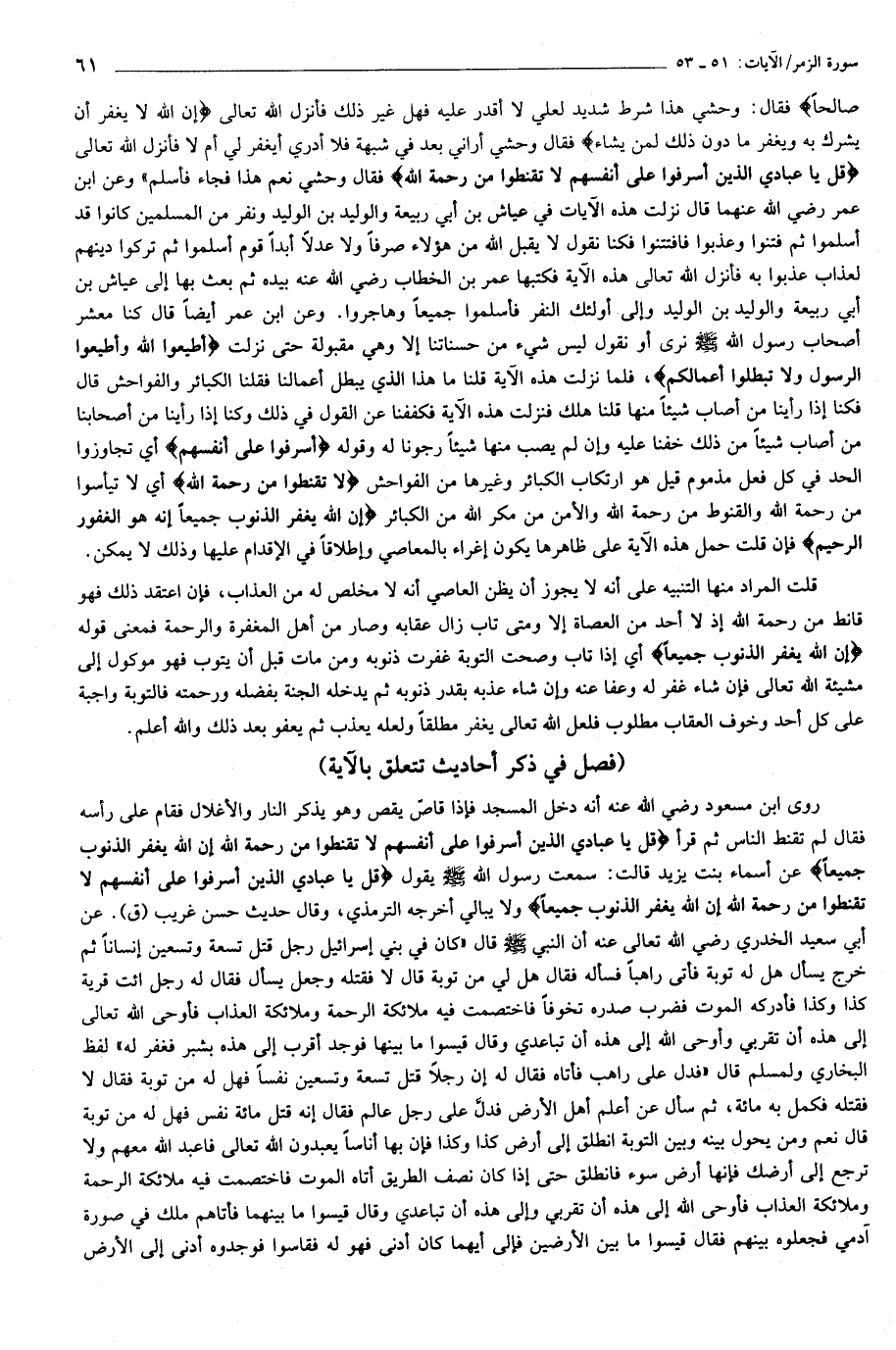 (فصل في ذكر أحاديث تتعلق بالآية) روى ابن مسعود رضي الله عنه أنه دخل المسجد فإذا قاصّ يقص وهو يذكر النار والأغلال فقام على رأسه فقال لم تقنط الناس ثم قرأ قُلْ يا عِبادِيَ الَّذِينَ أَسْرَفُوا عَلى أَنْفُسِهِمْ لا تَقْنَطُوا مِنْ رَحْمَةِ اللَّهِ إِنَّ اللَّهَ يَغْفِرُ الذُّنُوبَ جَمِيعاً عن أسماء بنت يزيد قالت: سمعت رسول الله صلّى الله عليه وسلّم يقول قُلْ يا عِبادِيَ الَّذِينَ أَسْرَفُوا عَلى أَنْفُسِهِمْ لا تَقْنَطُوا مِنْ رَحْمَةِ اللَّهِ إِنَّ اللَّهَ يَغْفِرُ الذُّنُوبَ جَمِيعاً ولا يبالي أخرجه الترمذي، وقال حديث حسن غريب (ق). عن أبي سعيد الخدري رضي الله تعالى عنه أن النبي صلّى الله عليه وسلّم قال «كان في بني إسرائيل رجل قتل تسعة وتسعين إنسانا ثم خرج يسأل هل له توبة فأتى راهبا فسأله فقال هل لي من توبة قال لا فقتله وجعل يسأل فقال له رجل ائت قرية كذا وكذا فأدركه الموت فضرب صدره تخوفا فاختصمت فيه ملائكة الرحمة وملائكة العذاب فأوحى الله تعالى إلى هذه أن تقربي وأوحى الله إلى هذه أن تباعدي وقال قيسوا ما بينها فوجد أقرب إلى هذه بشبر فغفر له» لفظ البخاري ولمسلم قال «فدل على راهب فأتاه فقال له إن رجلا قتل تسعة وتسعين نفسا فهل له من توبة فقال لا فقتله فكمل به مائة، ثم سأل عن أعلم أهل الأرض فدلّ على رجل عالم فقال إنه قتل مائة نفس فهل له من توبة قال نعم ومن يحول بينه وبين التوبة انطلق إلى أرض كذا وكذا فإن بها أناسا يعبدون الله تعالى فاعبد الله معهم ولا ترجع إلى أرضك فإنها أرض سوء فانطلق حتى إذا كان نصف الطريق أتاه الموت فاختصمت فيه ملائكة الرحمة وملائكة العذاب فأوحى الله إلى هذه أن تقربي وإلى هذه أن تباعدي وقال قيسوا ما بينهما فأتاهم ملك في صورة آدمي فجعلوه بينهم فقال قيسوا ما بين الأرضين فإلى أيهما كان أدنى فهو له فقاسوا فوجدوه أدنى إلى الأرض