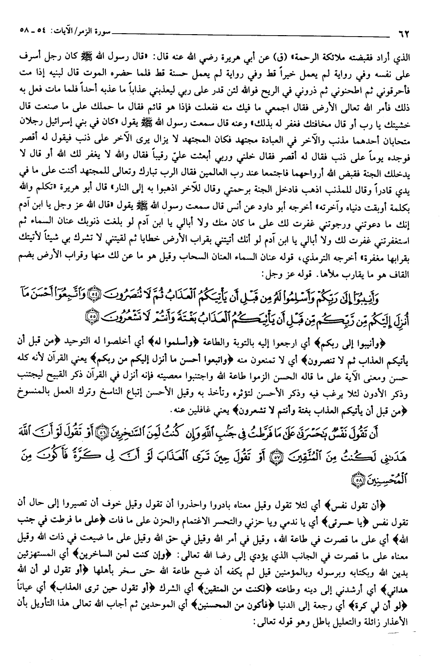 أَنْ تَقُولَ نَفْسٌ يا حَسْرَتى عَلى ما فَرَّطْتُ فِي جَنْبِ اللَّهِ وَإِنْ كُنْتُ لَمِنَ السَّاخِرِينَ (56) أَوْ تَقُولَ لَوْ أَنَّ اللَّهَ هَدانِي لَكُنْتُ مِنَ الْمُتَّقِينَ (57) أَوْ تَقُولَ حِينَ تَرَى الْعَذابَ لَوْ أَنَّ لِي كَرَّةً فَأَكُونَ مِنَ الْمُحْسِنِينَ (58)