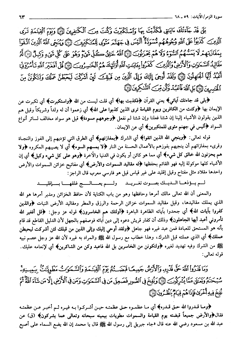 بَلى قَدْ جاءَتْكَ آياتِي فَكَذَّبْتَ بِها وَاسْتَكْبَرْتَ وَكُنْتَ مِنَ الْكافِرِينَ (59) وَيَوْمَ الْقِيامَةِ تَرَى الَّذِينَ كَذَبُوا عَلَى اللَّهِ وُجُوهُهُمْ مُسْوَدَّةٌ أَلَيْسَ فِي جَهَنَّمَ مَثْوىً لِلْمُتَكَبِّرِينَ (60) وَيُنَجِّي اللَّهُ الَّذِينَ اتَّقَوْا بِمَفازَتِهِمْ لا يَمَسُّهُمُ السُّوءُ وَلا هُمْ يَحْزَنُونَ (61) اللَّهُ خالِقُ كُلِّ شَيْءٍ وَهُوَ عَلى كُلِّ شَيْءٍ وَكِيلٌ (62) لَهُ مَقالِيدُ السَّماواتِ وَالْأَرْضِ وَالَّذِينَ كَفَرُوا بِآياتِ اللَّهِ أُولئِكَ هُمُ الْخاسِرُونَ (63)