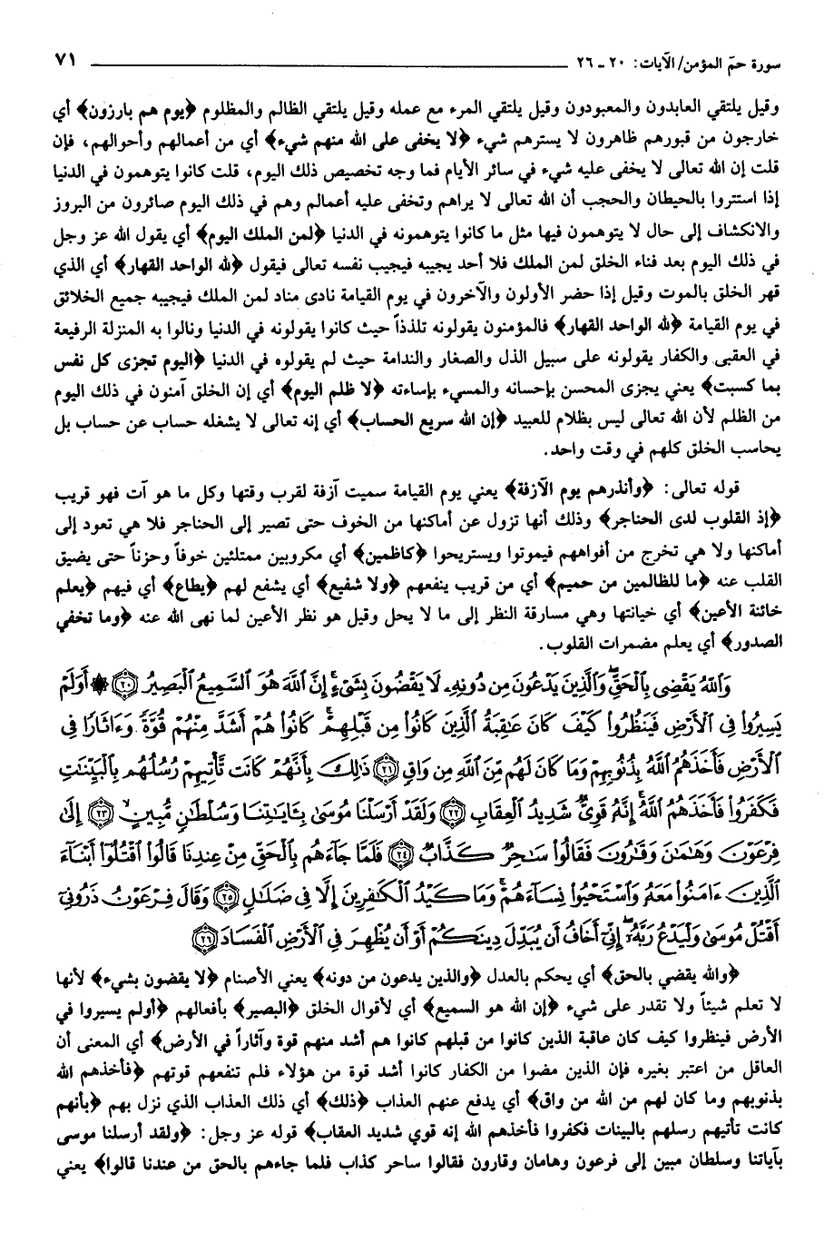 وَاللَّهُ يَقْضِي بِالْحَقِّ وَالَّذِينَ يَدْعُونَ مِنْ دُونِهِ لا يَقْضُونَ بِشَيْءٍ إِنَّ اللَّهَ هُوَ السَّمِيعُ الْبَصِيرُ (20) أَوَلَمْ يَسِيرُوا فِي الْأَرْضِ فَيَنْظُرُوا كَيْفَ كانَ عاقِبَةُ الَّذِينَ كانُوا مِنْ قَبْلِهِمْ كانُوا هُمْ أَشَدَّ مِنْهُمْ قُوَّةً وَآثاراً فِي الْأَرْضِ فَأَخَذَهُمُ اللَّهُ بِذُنُوبِهِمْ وَما كانَ لَهُمْ مِنَ اللَّهِ مِنْ واقٍ (21) ذلِكَ بِأَنَّهُمْ كانَتْ تَأْتِيهِمْ رُسُلُهُمْ بِالْبَيِّناتِ فَكَفَرُوا فَأَخَذَهُمُ اللَّهُ إِنَّهُ قَوِيٌّ شَدِيدُ الْعِقابِ (22) وَلَقَدْ أَرْسَلْنا مُوسى بِآياتِنا وَسُلْطانٍ مُبِينٍ (23) إِلى فِرْعَوْنَ وَهامانَ وَقارُونَ فَقالُوا ساحِرٌ كَذَّابٌ (24)