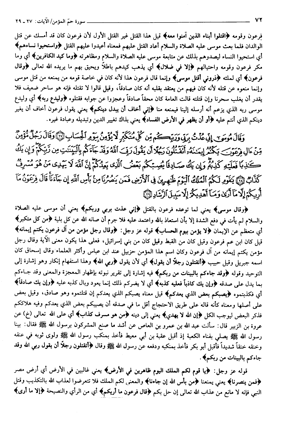 وَقالَ مُوسى إِنِّي عُذْتُ بِرَبِّي وَرَبِّكُمْ مِنْ كُلِّ مُتَكَبِّرٍ لا يُؤْمِنُ بِيَوْمِ الْحِسابِ (27) وَقالَ رَجُلٌ مُؤْمِنٌ مِنْ آلِ فِرْعَوْنَ يَكْتُمُ إِيمانَهُ أَتَقْتُلُونَ رَجُلاً أَنْ يَقُولَ رَبِّيَ اللَّهُ وَقَدْ جاءَكُمْ بِالْبَيِّناتِ مِنْ رَبِّكُمْ وَإِنْ يَكُ كاذِباً فَعَلَيْهِ كَذِبُهُ وَإِنْ يَكُ صادِقاً يُصِبْكُمْ بَعْضُ الَّذِي يَعِدُكُمْ إِنَّ اللَّهَ لا يَهْدِي مَنْ هُوَ مُسْرِفٌ كَذَّابٌ (28) يا قَوْمِ لَكُمُ الْمُلْكُ الْيَوْمَ ظاهِرِينَ فِي الْأَرْضِ فَمَنْ يَنْصُرُنا مِنْ بَأْسِ اللَّهِ إِنْ جاءَنا قالَ فِرْعَوْنُ ما أُرِيكُمْ إِلاَّ ما أَرى وَما أَهْدِيكُمْ إِلاَّ سَبِيلَ الرَّشادِ (29)